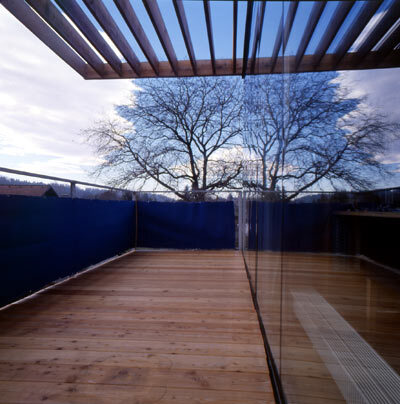Der Keller ist in den Hang geschoben, aus dem heizungsbergenden Sockel erwächst straßenseitig mit Nurglasfassade vor Stahlstützen das mit Sichtbetonkern und versiegeltem Betonestrich hochreduzierte Büro. Es bildet mit eigenem Eingang eine vom Wohnen darüber getrennte, autonome Einheit. Eine mit dem Hang ansteigende, abgesetzte Sichtbetonwand schafft rund um den Ateliersockel im Westen einen, von der Terrasse darüber teils gedeckten Weg. Er spendet angenehm diffuse Helligkeit und weitet sich im Norden am meditativen Lichthof zum Himmel. Mild fällt die Sonne auf die rauen Oberflächen, verbreitet dahinter ruhigkonzentrierte Atmosphäre. Hier werden Modelle gebaut oder Besprechungen abgehalten, im vollverglasten Südwesten sind die Arbeitsplätze mit Blick auf Waldsaum und anfahrende Kunden. Hier ist unter der südlichen Wohnraumterrasse ein schöner, bekiester Vorplatz. Im mittigen Betonblock mit Teeküche und Sanitäreinheit führt eine Treppe mit dezentem Sichtkontakt ins Private.