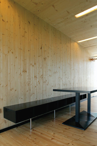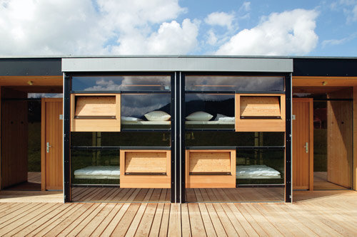 Modulares Bauen, Serienproduktion, Flexibilität, Ortsungebundenheit, all dies suggeriert der vor rund fünf Jahren formulierte Anspruch von HolzBox. Das Innsbrucker Architekturbüro konnte 2003 den Wettbewerb der steiermärkischen Landesregierung für ein multifunktionales Campmodul für Jugendliche und Familien für sich entscheiden. Das modulare Musterkonzept sollte die architektonische, infrastrukturelle und funktionale Qualität von Ferienherbergen verbessern. Gefordert waren ein Betreuermodul mit einem Bett, ein Jugendraummodul mit sechs und ein Familienmodul mit vier bis fünf Betten. Die Lösung von HolzBox war einfach: drei gleich lange, beliebig kombinierbare Containermodule aus Massivholzplatten. Denn obwohl ursprünglich eine Ausführung in Holzrahmenbauweise geplant war, entschieden sich die Architekten im Lauf des Umsetzungsprozesses für die Holzmassivbauweise mit Brettsperrholzplatten, da diese, so Ferdinand Reiter, der Architektur viel eher entsprach und nicht zuletzt aufgrund der geografischen Nähe zu den steirischen Produzenten auf der Hand lag.