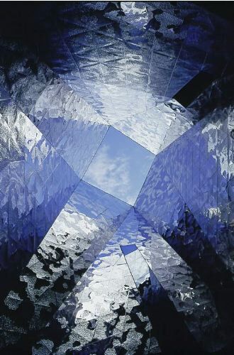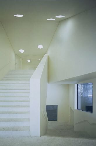 Das in der Struktur der unteren Fassade abstrahierte Wolkenmuster findet man auf dem Dach wieder: nicht nur am Himmel, sondern auch auf einer Wasserfläche gespiegelt, die verschiedene Inseln und Einschnitte umschließt. In einem der Höfe läuft das Wasser die Fassade hinab und tröpfelt in ein Becken, ein anderer dient als Hochzeitskapelle, einen dritten betritt man vom Untergeschoß aus und blickt überrascht nach oben: Er setzt sich leicht verschoben und verspiegelt durch das Ausstellungsgeschoß hindurch in den Himmel fort, von oben schauen Touristen herunter.