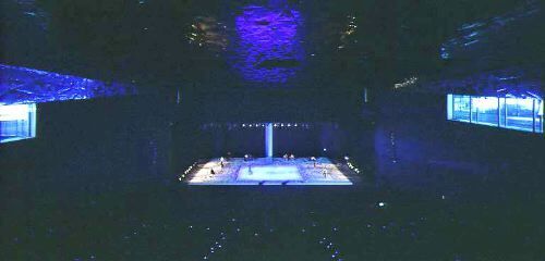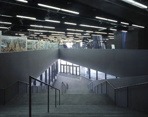 Zurück zum Käse. Dem Ankommenden präsentiert sich Herzog & de Meurons Vortrags-, Konzert- und Ausstellungsgebäude wundersam schwebend. Eine hermetische Fassade aus blauem Grobputz und verspiegelten Fensterschlitzen verbirgt das frei einteilbare Obergeschoß. Darunter fließt die Esplanada hindurch, nur ab und zu unterbrochen von einem der Zugänge und dem Auditorium als Kern des Ganzen - alles transparent und offen für Blicke hinein und hinaus. Der 3200 Personen fassende Saal wölbt sich vom Untergeschoß bis unters Dach und ist unterirdisch mit dem Kongresszentrum verbunden. Auch wenn der Platzraum unter dem schwebenden Volumen sich von neun Meter Höhe auf wenig mehr als zwei Meter reduziert, kommt nie Beklemmung auf. Der Grund ist die spiegelnde Decke - die Architekten nennen auch sie Fassade -, in deren dreieckige Edelstahlpanele ein unregelmäßiges Ornament geprägt ist, das sich ohne Unterbrechung fortsetzt. Keines der 28.000 Panele gleicht einem anderen.