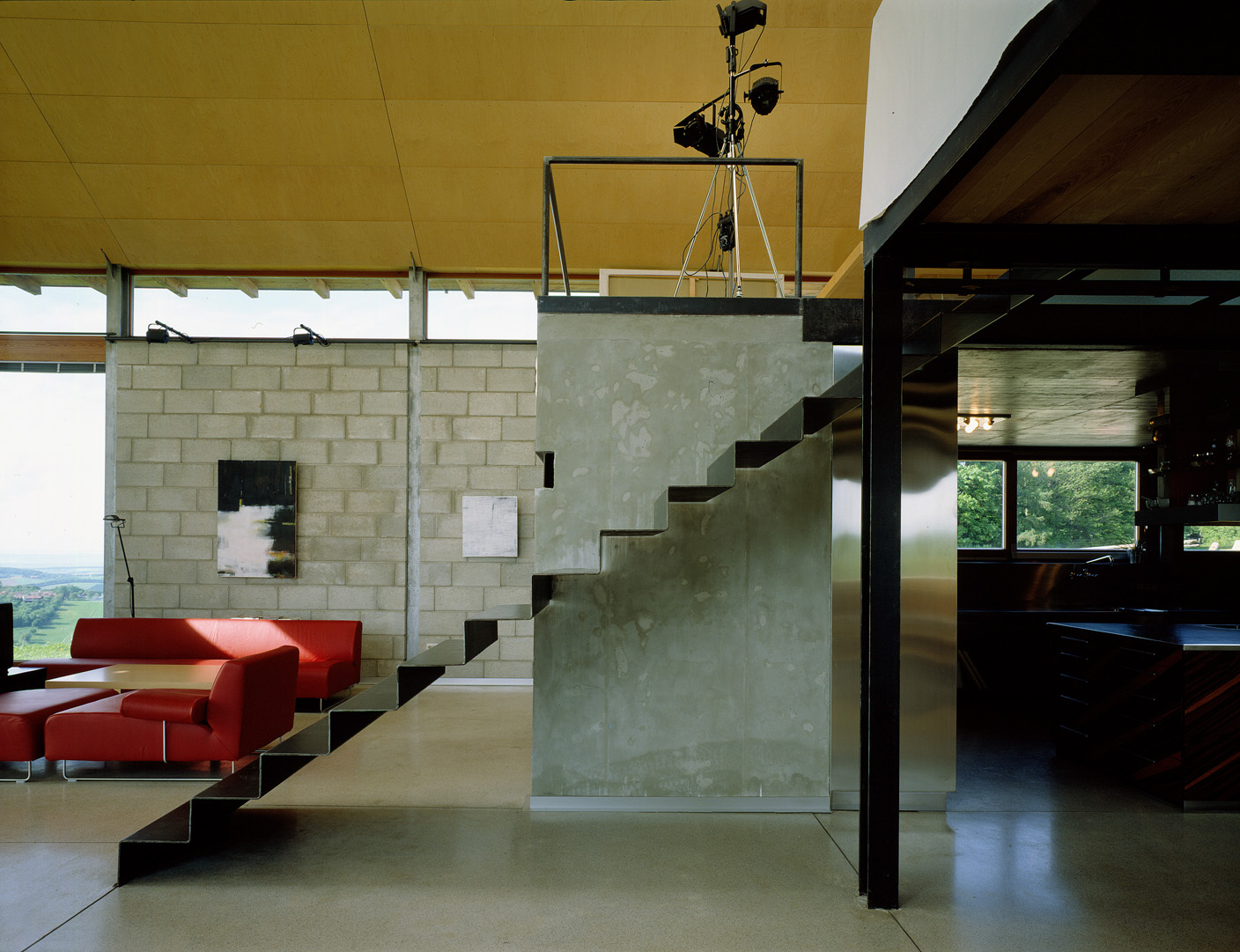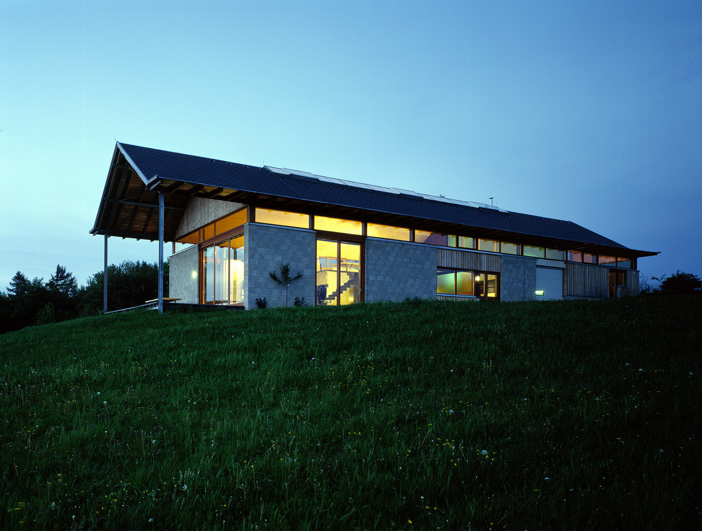 Ein Stahlskelett bildet die Tragstruktur des rudimentären, ca. 8,80 m breiten, 30 Meter langen satteldachgedeckten Baukörpers. 7,5 Meter misst er bis zum von Mattglasscheiben aufgelösten First, 80 cm hohe Fensterbänder flankieren beide Längsfronten unter der Traufe. Sie kragt als Wartungsumgang und baulicher Sonnenschutz ein Meter aus. Innen und außen unverputzte Betonsteine bilden mit 10 Zentimeter hinterlüfteter Dämmung als Speichermasse ein energetisch optimiertes Dreischichtmauerwerk, die Heizkosten der Riesenkubatur betragen ca. 540 Euro/Jahr, der perfektionistische Eigenbauer Oberlik drückte den Quadratmeter-Preis auf 726 Euro brutto.