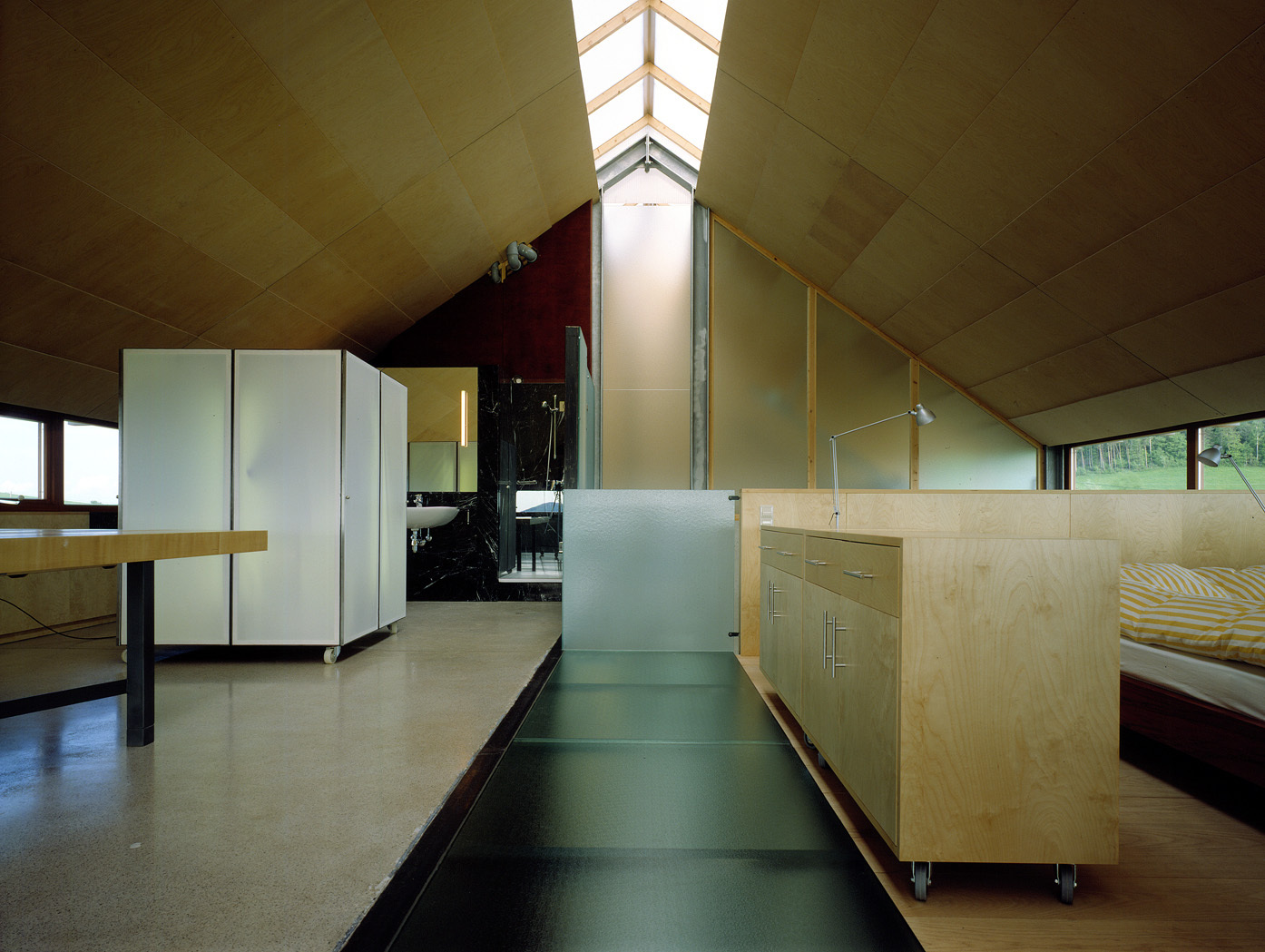 Die Toilette am Entree ist der einzige Abschlussraum im Wohnhaus, selbstverständlich markiert der freistehende Herd mit schwebender Glasablage, großer Tafel mit Eckbank im Süden den Essbereich, die Gastroküche im Norden genügt allen Ansprüchen. In der Mitte führt eine einläufige Treppe auf die Galerieebene. Hier hat die professionell malende Bauherrin ihr Atelier mit Oberlicht, vis à vis steht das Bett, dahinter der offene Sanitärraum.