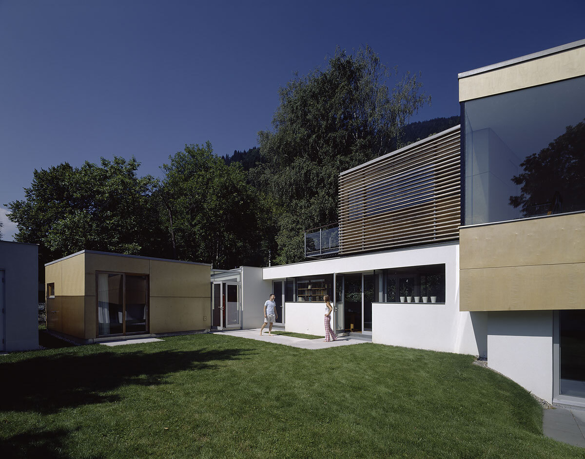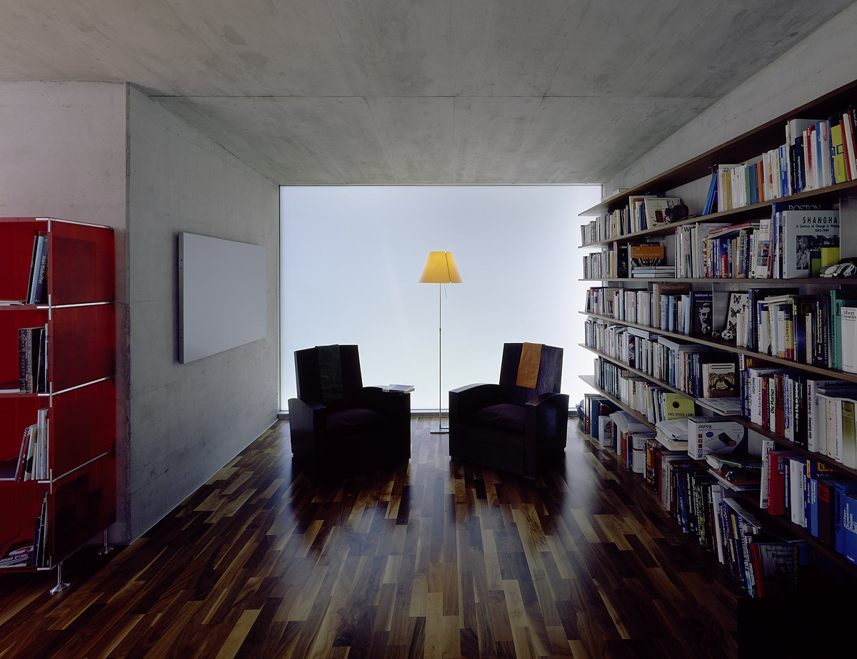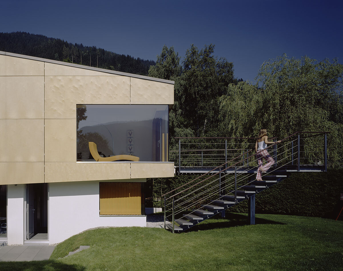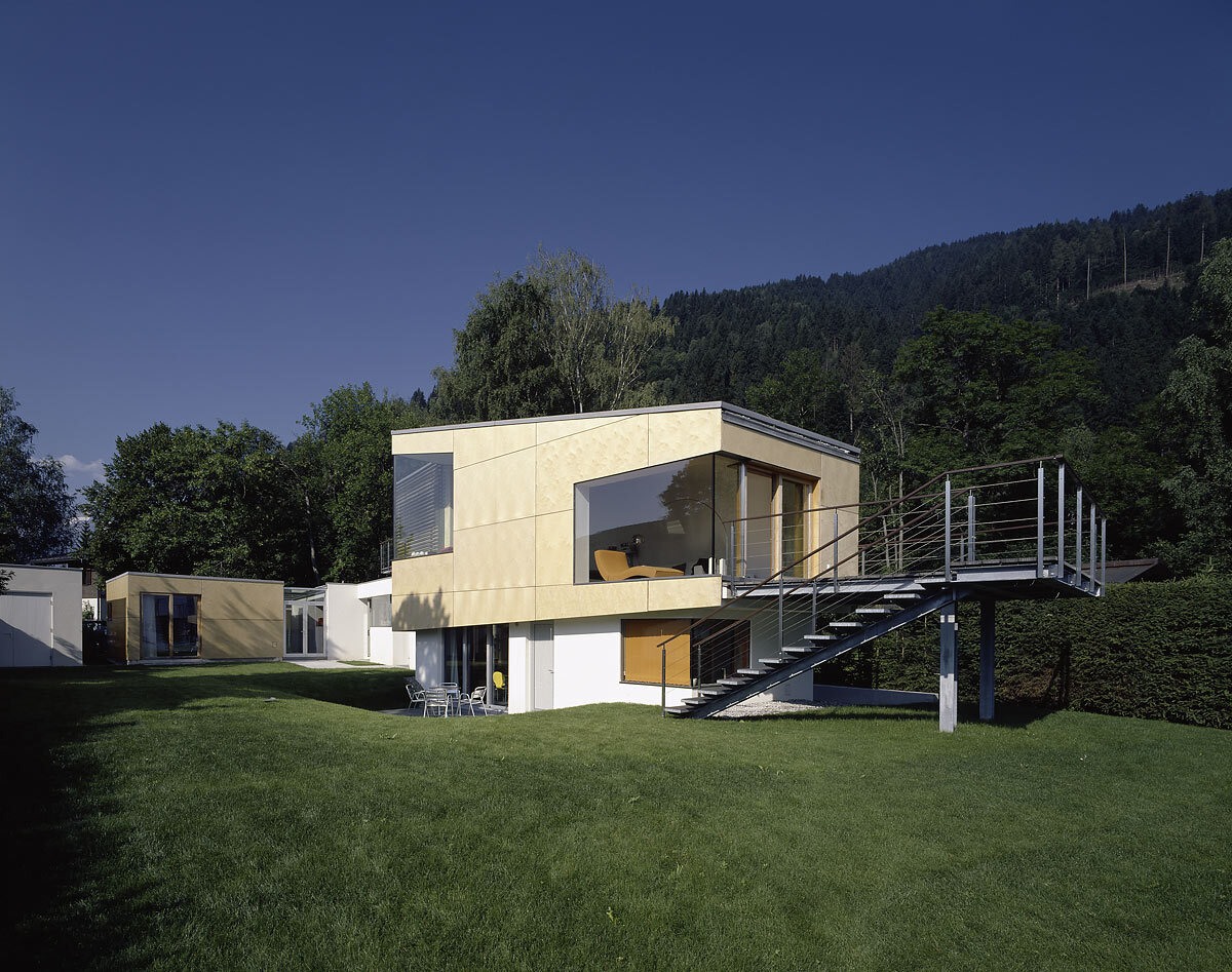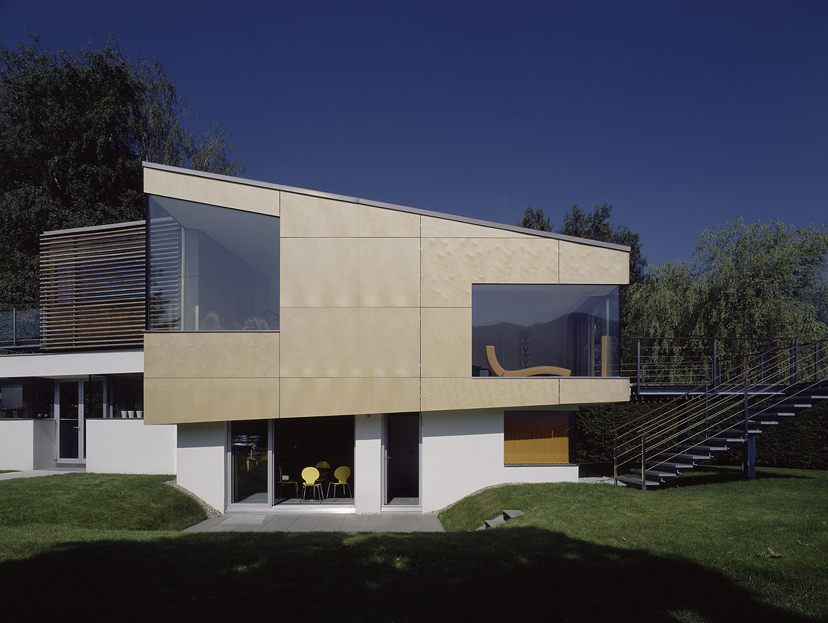 Das weltoffene Paar hat oft Gäste, braucht aber auch Rückzugszonen, er will ungestört in seinen vielen Büchern lesen, die Zeller Verwandtschaft sollte weiter baden können. In hoher Detailsorgfalt plante Karl-Heinz Machat eine ausdifferenzierte Baukörperkomposition, deren offenes Raumgefüge dem weiten Horizont der Bewohner entspricht. Er hatte die künstlerische, Architekt Christian Gritznig die technische Oberbauleitung. Wie am Ufer flüssiges Wasser auf feste Erde trifft, verbinden sich im eingegrabenen, von Einschnürungen, Öffnungen und Treppen strukturierten Raumfluss des Sichtbetonsockels Geselligkeit und Konzentration, Innen – und Außen. Obere, private Ebene und Gästehaus sind im Holzleichtbau konstruiert, bilden birkenholzverkleidet den „weichen“ Kontrast zum massiven Erdgeschoß.