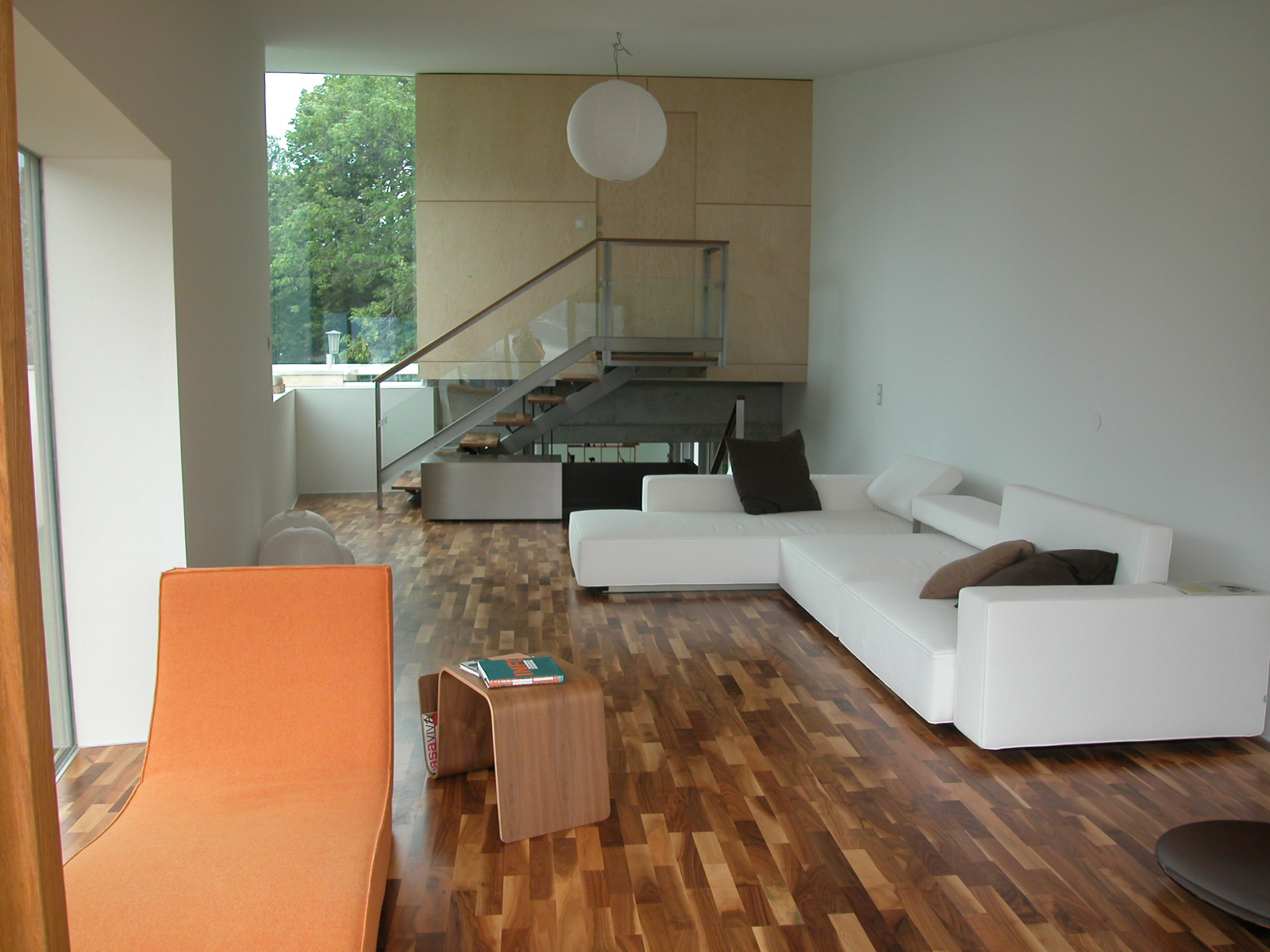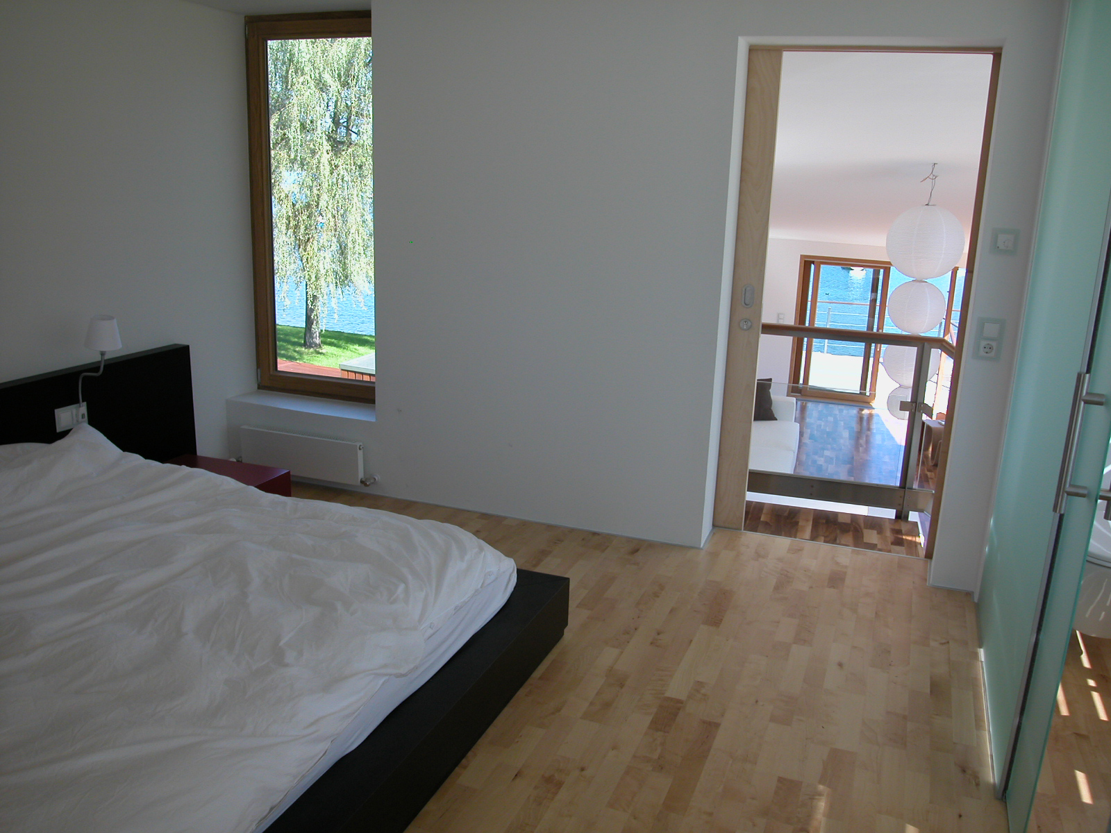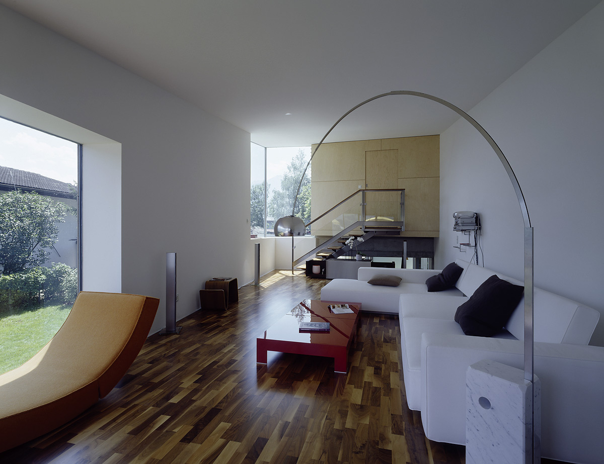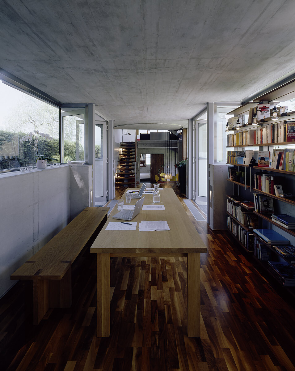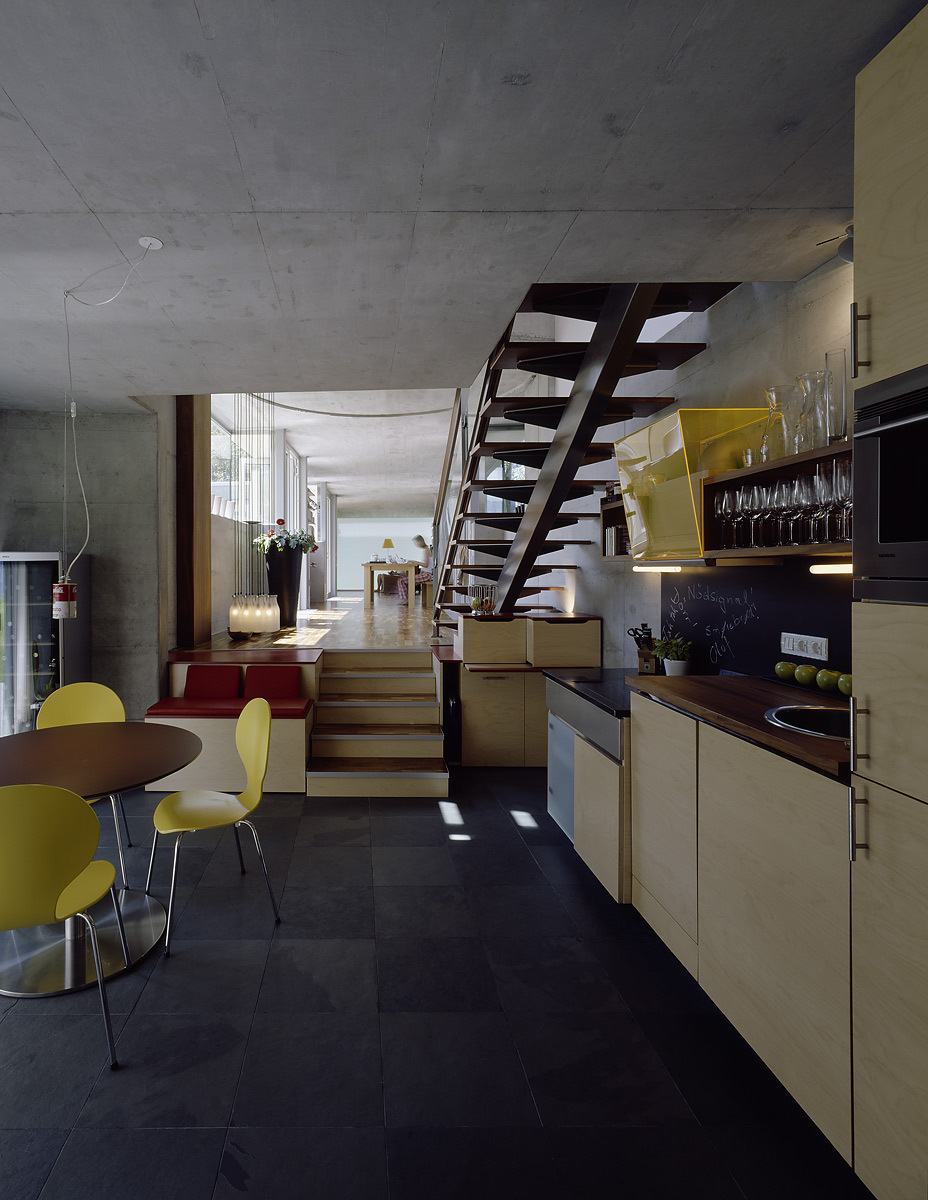 Das weltoffene Paar hat oft Gäste, braucht aber auch Rückzugszonen, er will ungestört in seinen vielen Büchern lesen, die Zeller Verwandtschaft sollte weiter baden können. In hoher Detailsorgfalt plante Karl-Heinz Machat eine ausdifferenzierte Baukörperkomposition, deren offenes Raumgefüge dem weiten Horizont der Bewohner entspricht. Er hatte die künstlerische, Architekt Christian Gritznig die technische Oberbauleitung. Wie am Ufer flüssiges Wasser auf feste Erde trifft, verbinden sich im eingegrabenen, von Einschnürungen, Öffnungen und Treppen strukturierten Raumfluss des Sichtbetonsockels Geselligkeit und Konzentration, Innen – und Außen. Obere, private Ebene und Gästehaus sind im Holzleichtbau konstruiert, bilden birkenholzverkleidet den „weichen“ Kontrast zum massiven Erdgeschoß.