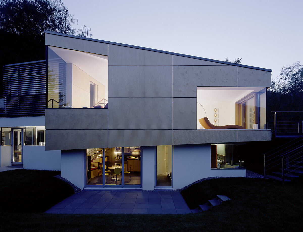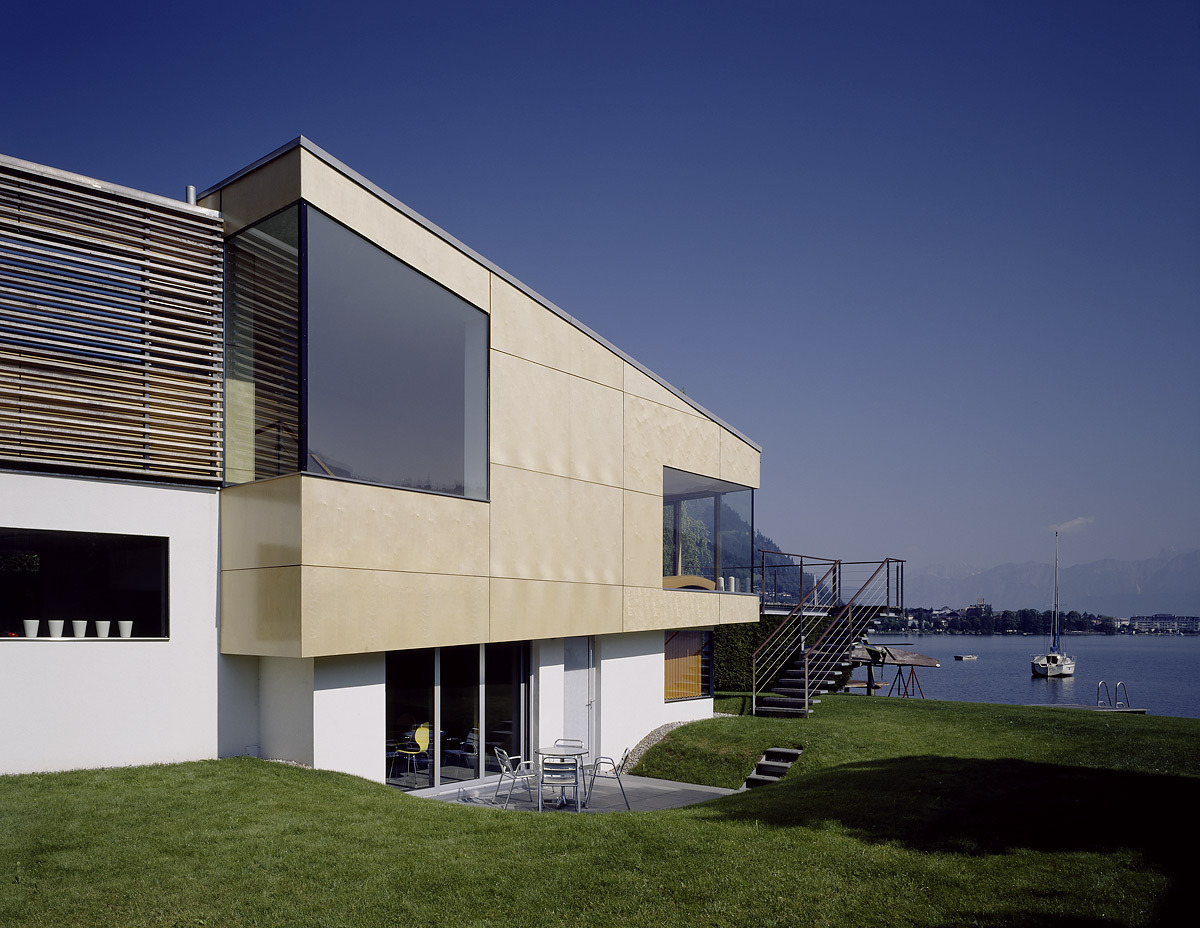 Das Haus scheint dem Ufer zu entsteigen, von der Küche führt eine filigrane Edelstahltreppe ins Wohnzimmer, schräg steigt das Pultdach vom Über-Eck-Panoramaglas an, zoomt in perspektivischer Verkürzung den See gleichsam über die Terrasse hinein, ihre Seilbrüstung zitiert Schiffstaue. Den Gebirgsblick holt die zweite Übereckverglasung ins Haus, Stufen führen in die abschließende, intime Schlafholzbox mit Balkon überm Sockel.