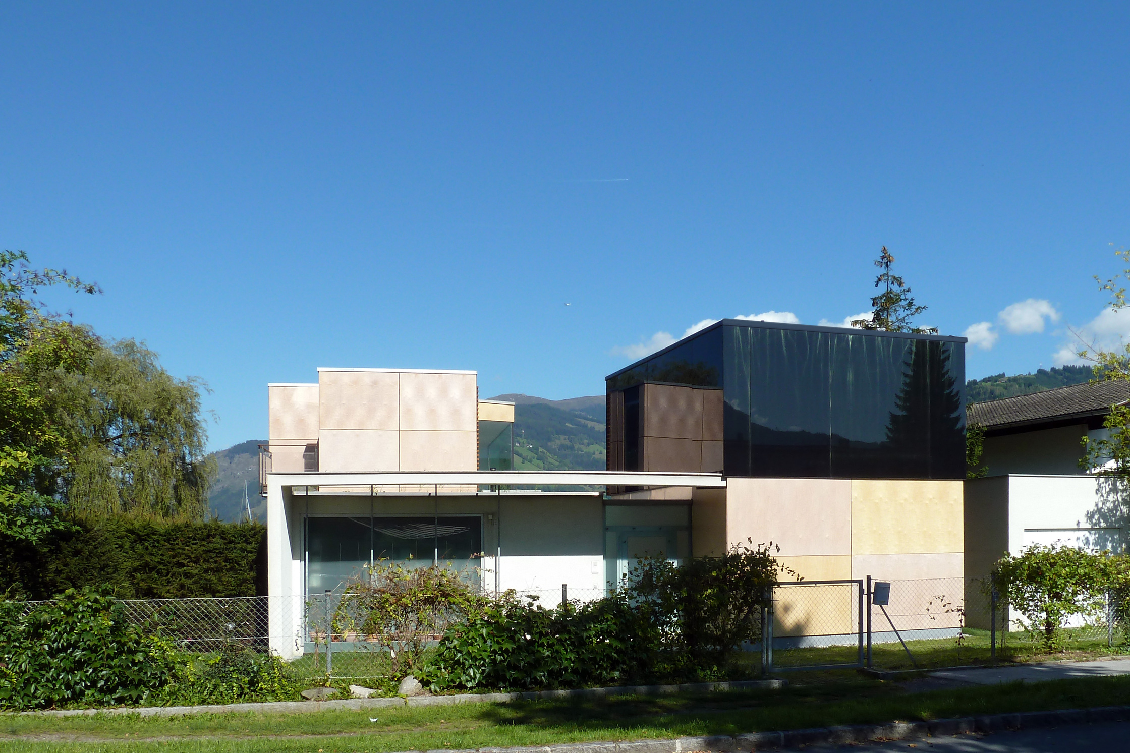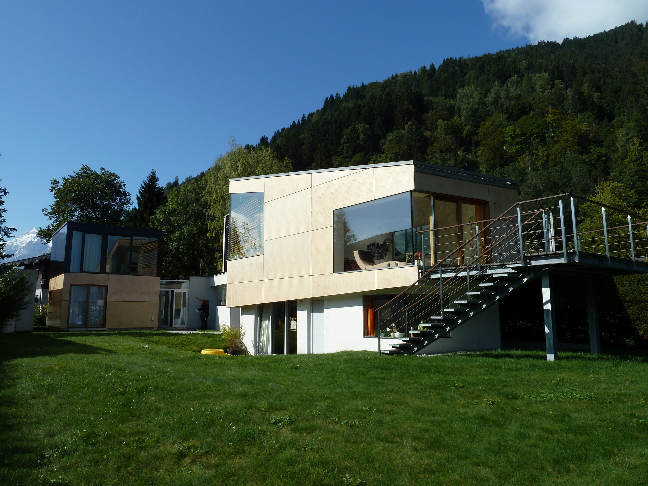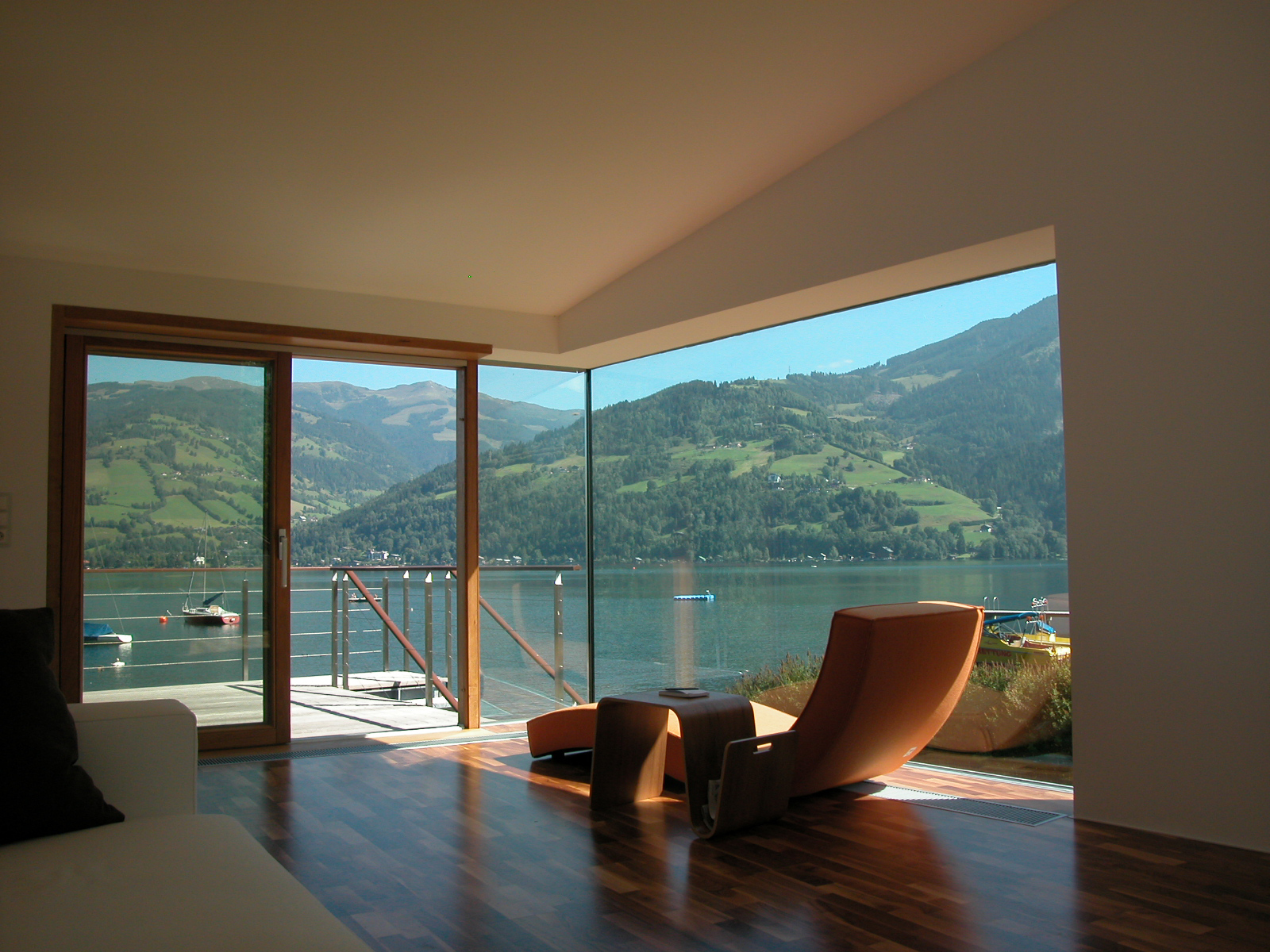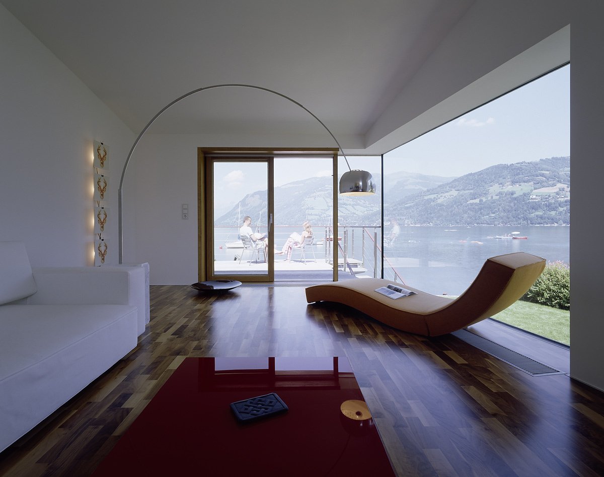Zell am See hat alles, was man wünschen kann: einen verwinkelten Ortskern mit romanischer Kirche, Wachtturm, Schloss Rosenberg, gepflegte Kuratmosphäre an der Seepromenade, das einstige Flair der exklusiven Sommerfrische an der Westbahn umweht die Grand Hotel Terrasse. Die Gipfel von Kitzsteinhorn, Hohen Tauern bis zum Glockner spiegeln sich im Wasser, auf dem Boote treiben. Die Schmittenhöhenseilbahn brachte Wintertourismus, der Zauber des Ortes blieb. In den Siebzigern war hier leicht bauen, viele Einfamilienhäuser säumen den See, vereinzelt ranken sich Bergbauerhöfe Steilhänge hoch. Heute ist die Stadtgemeinde mit Baubewilligungen restriktiver: fast das ganze Ufer in 500 Meter Luftlinie ist Naturschutzgebiet. Die Mutter des Bauherrn und ihr Partner sind alteingesessene Zeller, sie hatten eine Badehütte am Südufer, oft gehen sie schwimmen. Der Sohn lebt und lehrt heute in Boston. Als die Umwidmung der 860 Quadratmeter Baugrund bevorstand, entschied er sich mit seiner Lebensgefährtin für einen zweiten Wohnsitz in Zell. Er nahm die Bauherrnschaft am sensiblen Ort sehr ernst und schrieb unter vier Architekten einen Wettbewerb mit Preisgeld aus.