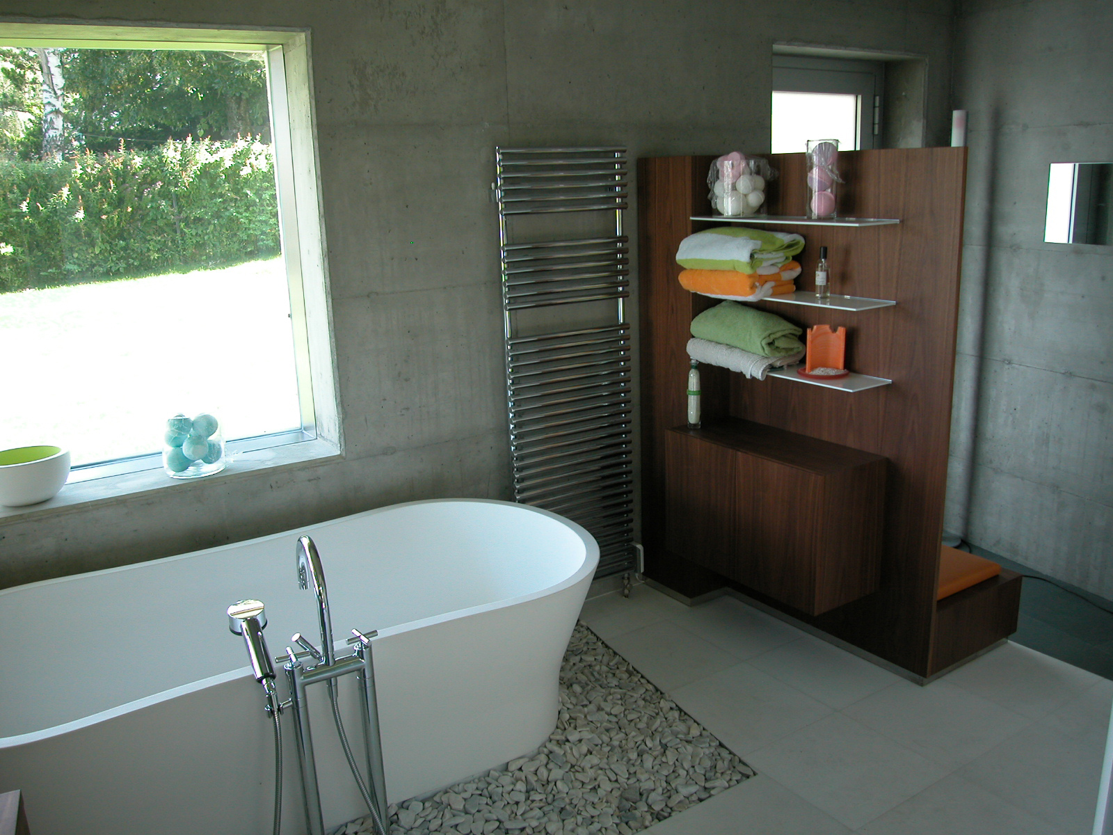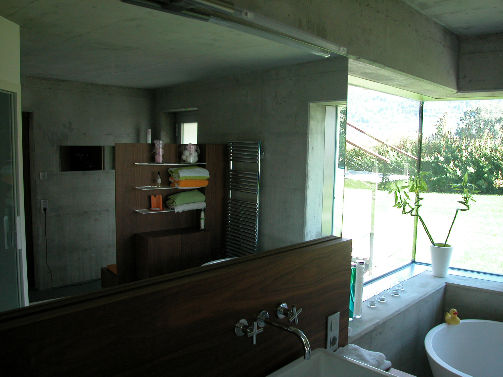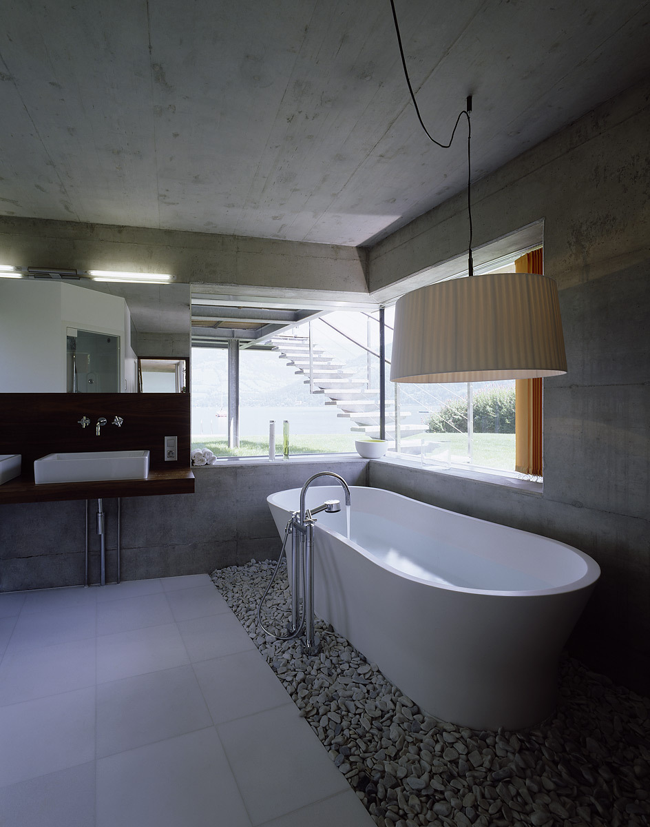 Der Niveausprung der Stiege hinab zum See markiert den Übergang zur Geselligkeit. Vorm Küchenvorsprung verdichtet sich die Wiese in der abgesenkten Terrasse zur geschützten Mulde, von der die Badegäste ihre Garderobe mit Bad betreten. Die Wanne ist auf Wasserniveau, hinter einer Sichtbetonscheibe im Westen eine Sonnen- und Saunaterrasse mit zweitem externen Entree.