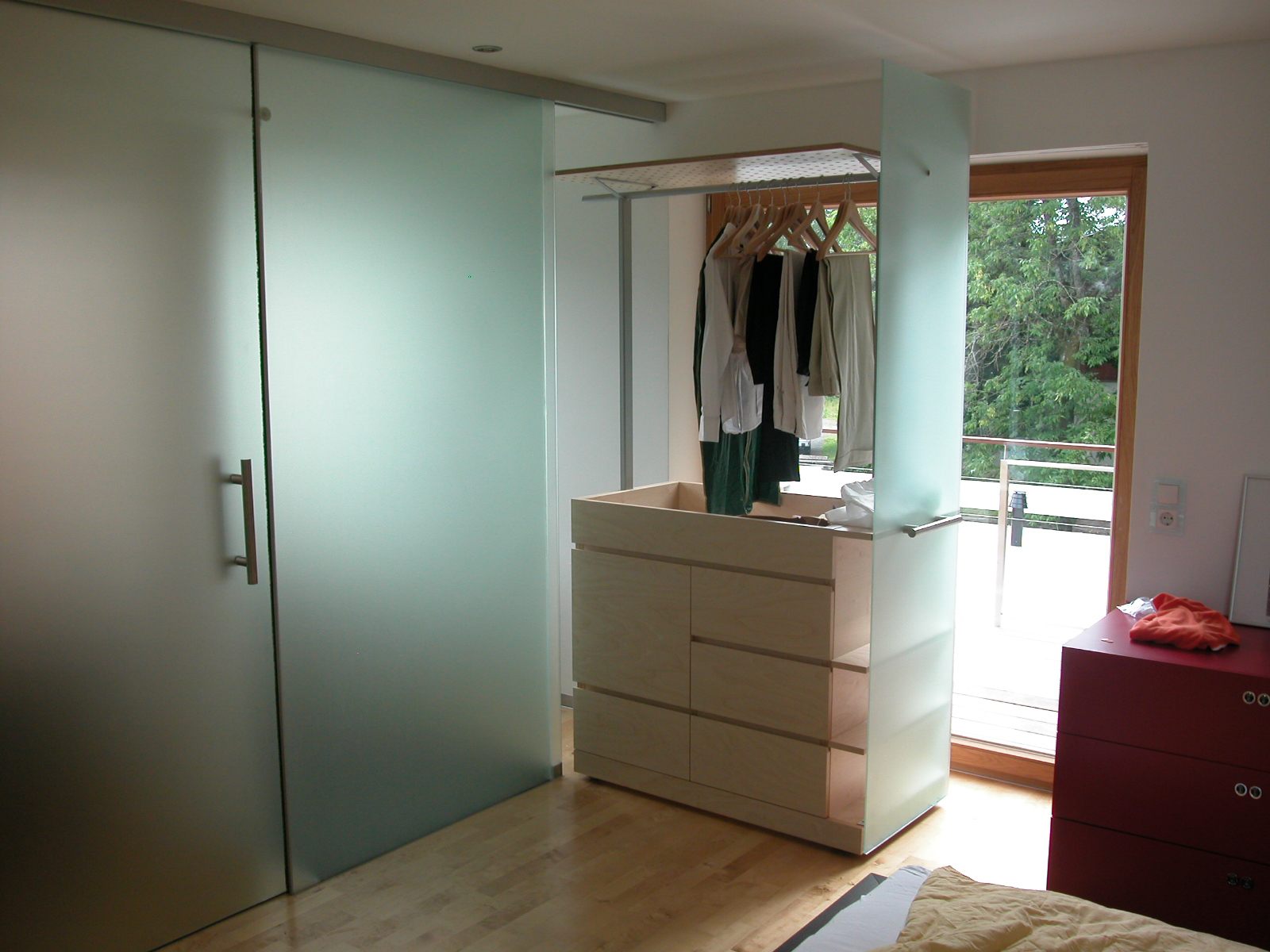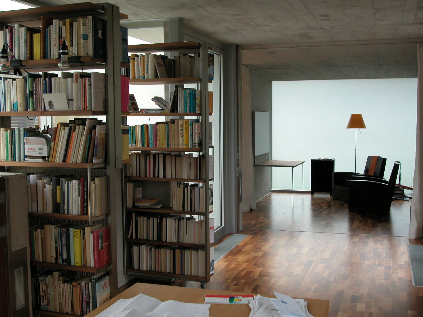 Es erstreckt sich vom See im Nordosten zur Straße im Südwesten, wo das nahe, starkfrequentierte Strandband ist. Hier wirkt der leicht vorspringende, niedere Gästeholzwürfel als ruhiger Schutzfilter, ein zarter Sichtbetonrahmen bildet Witterungsschutz mit Himmelsblick und die elegante Klammer zum Haus, als transparentes Zwischenelement sitzt der glasüberdachte Vorraum zwischen den Baukörpern. Der Sockel an der westlichen Längsseite macht den Garten zur großen Liegewiese. Schon vom straßenseitigen Bibliotheksauftakt sieht man den See, zwei Glastüren schaffen die erste räumliche, blickweitende Einschnürung, Sichtbetonscheiben dahinter die Arbeitszone vorm nächsten Lichtschlitz. Der nischenbildende Rhythmus schafft dem schreitenden Denker einen Wandelgang an der Bibliothek. Der Grünraumstreifen davor ist als japanischer, englischer und französischer Garten geplant.