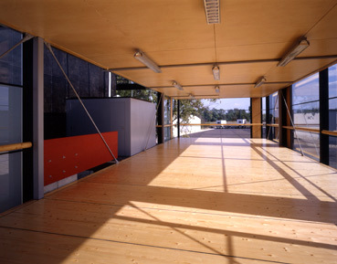 Der ruhige, offene Raum mit der leuchtröhrenbestückten Birkensperrholzdecke und dem tragenden Massivholzboden bietet Kulturevents einen bezugsreichen Panoramarahmen. Sein rundumlaufender, absturzsichernder Handlauf ist sogar balletttauglich, leitungsführende Bodenkanäle ermöglichen Büronutzung, Zwischenwände die bedarfsweise Unterteilung zur Zelle.