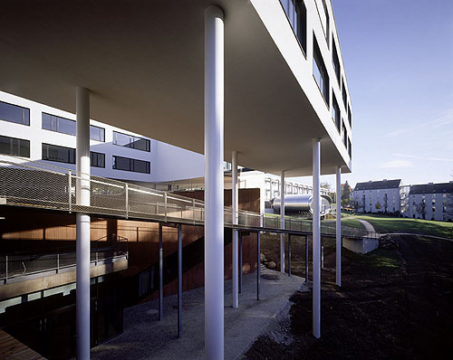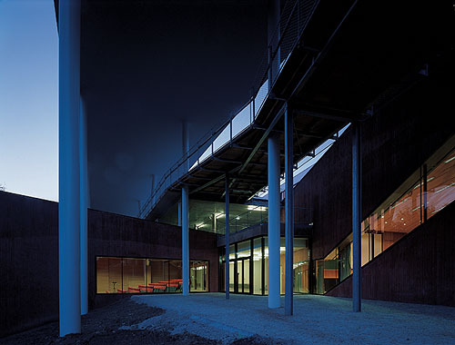 Diesen Punkt haben Berger+Parkkinen übernommen. Auch in den Nachbargebäuden ist ein Geschoß für parkende Autos reserviert. Was den Vorteil hat, dass der Flächenverbrauch am Rande des Hagenberger Schlossparks auf die Gebäude und Erschließungsstraßen beschränkt bleibt, obwohl hier, eine Dreiviertelautostunde nordöstlich von Linz, jeder einen Wagen hat, der geparkt werden will. Nur sind Berger+Parkkinen mit ihrem Bauteil, dem dritten der FH, um einiges radikaler als die bloß aufgebockten Kisten in ihrer Umgebung. Das abfallende Gelände ausnutzend, senken sie die Parkplätze in den Hang hinein und überdecken sie mit einer Platte, auf der ein Platz entsteht, durch den der Hagenberger Campus diesen Namen erst wirklich verdient.