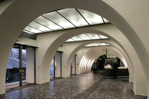 Das Siegerprojekt von Kinayeh und Markus Geiswinkler punktete mit einer klaren Organisation und dramatischen vertikalen Durchblicken, die den Weg vom Foyer in den Vortragssaal zwei Stockwerke tiefer zu einem Erlebnis machen. Zu diesem Zeitpunkt blieb gerade noch ein Jahr bis zur Eröffnung. Mitten in einem laufenden Bauprojekt Umplanungen vorzunehmen, noch dazu angesichts eines staatstragenden Fertigstellungstermins, ist ein Himmelfahrtskommando, das in diesem Fall bravourös bewältigt wurde. Nicht alle Leistungen sind dabei so sichtbar wie die präzise detaillierten Übergänge zwischen Alt und Neu oder die raffinierte Belichtung, die von Bartenbach Lichttechnik konzipiert wurde. Genauso wichtig ist das, was unsichtbar bleibt: die Lüftung, die so umgeplant werden konnte, dass sie den vertikalen Raumeindruck nicht mehr stört, oder die statischen Kunstgriffe, mit denen im Vortragsraum eine Nische geschaffen wurde, die dem Raum erst die richtige Proportion gibt.