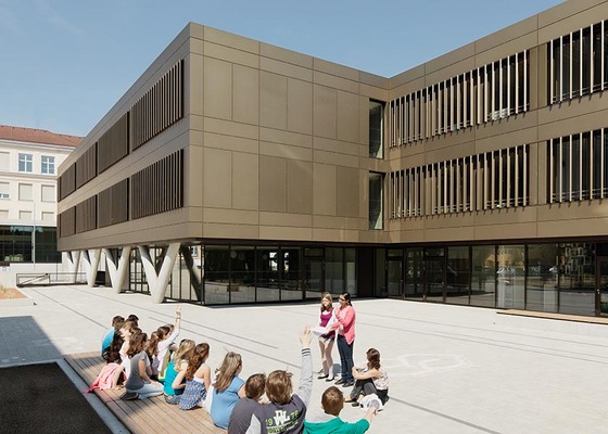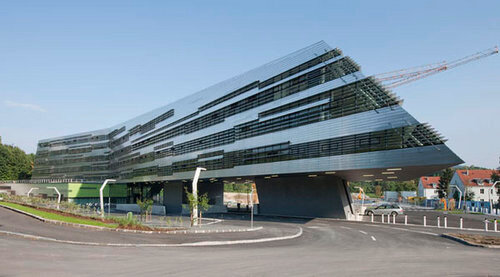 Diese Qualität wurde hauptsächlich dadurch erreicht, dass die Architekten ein Atrium im ersten Stock in den Mittelpunkt des Entwurfs setzten. Das Atrium ist seitlich offen, über einen Steg auch aus dem Park direkt erreichbar und setzt sich in eine Loggia über dem Eingang fort. Diese ist auf drei Seiten offen und vom Körper des dritten Geschoßes überdacht. Die Erfahrung der Logik der inneren Raum- und Funktionsorganisation macht die äußere Erscheinung verständlich.