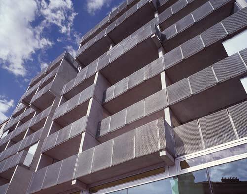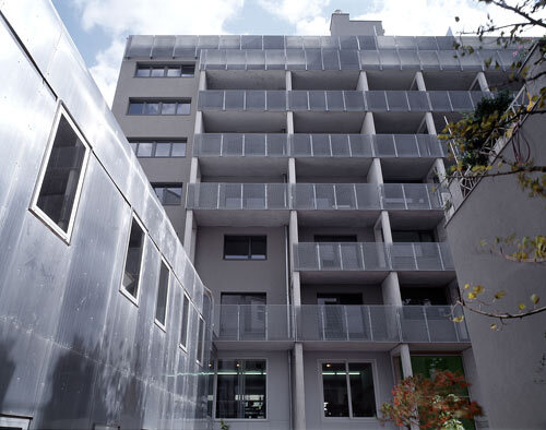 Flachstahlbrüstungen geben dem Filter Feinstruktur, den Terrassen bis zu 2,30 Meter Tiefe, seine Stahlbetonrahmen lassen ein Spalierobstgerüst assoziieren. An blickschützenden Trennwänden schafft ein verzinktes Blechpaneel bedarfsweise Stauraum. In Schrägstellung rahmt es den Freiraum wie eine Bühnenperspektive, die reflektierende Fläche lenkt mehr Südwestlicht hinein. Alle Regenrinnen sind unter Gittern außen geführt, was die Balkone noch vergrößert. Das verglaste Stiegenhaus wirkt nach außen als repräsentative Schnittstelle, innen ist es eine attraktive Kommunikationszone für alle.