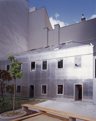 Im Sockel des Ost-Bauteils ist das neue ARTEC-Büro. Die edle Alu-Glasfassade mit Sichtbetontreppe verströmt zarte Noblesse, das transparente Schaufenster macht die Arbeit im offenen, reduziert gestalteten Fertigteileinraum spürbar und wertet das Quartier auf. Das alte Hinterhaus ist mitgenutzt, seine komplett mit walzblanken Aluminiumtafeln verkleidete Kubatur wirkt wie ein abstrakter Think Tank, ihre reflektierende Oberfläche mehrt das Licht im Nordhof. Von Mauern, Gärten, Kaminen und Dächern der Nachbarn umgeben, entwickelt er sein eigenes, exquisites Flair. Zierapfel-, Essig-und Maulbeerbaum, Bank und Ribisel am Spielplatz animieren zum Sitzen, Schauen und Plaudern.