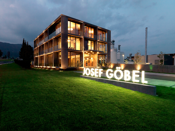 Die Brüder Gschwendtner entschieden sich für einen Architekturwettbewerb mit einer kleinen Zahl von geladenen Büros. Bei der Auswahl der Büros und der Fachpreisrichter in der Jury ließen sie sich vom Architekten Andreas Orgler beraten, besichtigten aber auch selbst Referenzprojekte, unter anderem das Gebäude der „Montfort Werbung“ in Klaus in Vorarlberg von Oskar Leo Kaufmann. Im Wettbewerb, zu dem sechs Architekten geladen waren, setzte sich Kaufmann mit einem Entwurf durch, der die Ideen dieses Referenzprojekts weiterführt. Alle Büroräume liegen auf einer Ebene, darunter ein offenes Parkgeschoß für die PKWs der Mitarbeiter, darüber ein Dachgarten als Erholungszone. Der annähernd quadratische Grundriss von rund 50 mal 40 Metern ist von drei Lichthöfen durchbrochen,