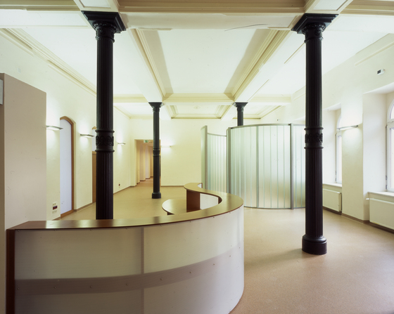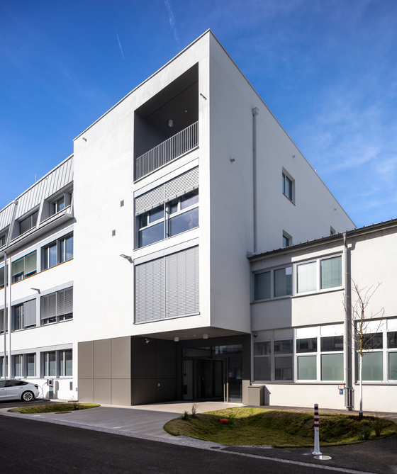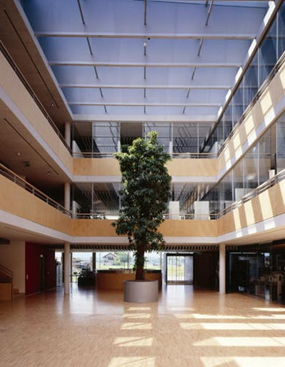 Was auf den ersten Blick wie ein neutraler Großraum aussieht, ist in Wirklichkeit eine fein abgestufte, aber dennoch flexibel nutzbare Raumfolge. Das Dach folgt mit einem leichten Knick dem Gefälle des Hangs, wodurch sich im Inneren größere Raumhöhen im Eingangsbereich und eine zusätzliche Belichtungsmöglichkeit durch ein Lichtband ergeben. Weil auch die Niveaus im Inneren leicht differenziert sind, kommt nirgendwo das Gefühl auf, in einer einfachen Glaskiste zu sitzen. Der Raum gleicht eher einer Landschaft, ein Eindruck, der durch die Innenwände und Fassaden aus Glas verstärkt wird. „Wenn ich morgens das Büro betrete“, berichtet ein Mitarbeiter, „sehe ich sofort die ganze Firma, alle Kollegen auf einen Blick.“ Die Glaswände schließen wenige Einzel- und viele Gruppenbüros ab und bieten dazwischen noch genug Freiräume für informelle Besprechungen.