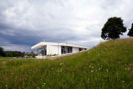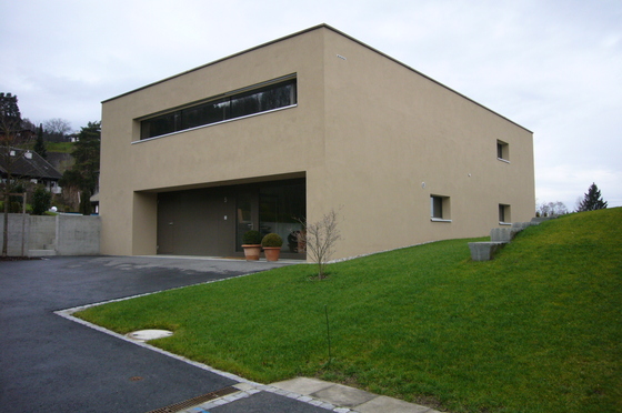 Heute betritt man das Grundstück im Süden, vom ehemaligen Dienstboteneingang her. Siegfried Meinhart hat die damit verunklärte, gerade für Häuser dieser Größenordnung besonders verunsichernde Wegführung korrigiert, indem er die Hangkante an der Südwestecke des verbliebenen Grundstückes mit einer geräumigen Garage sicherte, deren extensiv begrüntes Dach das Niveau des Gartens ausgleicht.