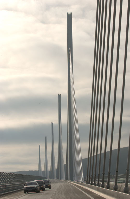 Der Viadukt von Millau, der auf einer Länge von 2400 Metern und in einer Höhe von bis zu 260 Metern das tief eingeschnittene Tal