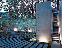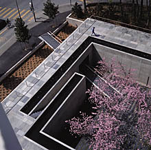 Dezentes Geplätscher erfüllt den 15 mal 15 Meter grossen Hof, dessen Boden mit rechteckigen schwarzen Schieferplatten belegt ist, zwischen denen sattgrünes Sternmoos wächst. Das bewegte, geordnete Gefüge der Schieferplatten erinnert an geflösste Baumstämme, die ein Fluss am Stauwehr zusammengetrieben hat. Der Boden scheint zu fliessen. Nur wo der Bauherr aus funktionalen Erwägungen nachträglich Platten einfügen liess, ist jegliche Bewegung erstarrt. Der Moosteppich zwischen den Platten verstärkt den Eindruck eines kühlen Wassergartens inmitten der Hitze der Stadt. Ringsum trennt ein Wasserkanal von einem Meter Breite wie eine Schattenfuge die mit Stahlkanten gefasste Bodenplatte von den Betonwänden. Aus regelmässig eingefügten Aussparungen der Wände fliesst Wasser glitzernd über geriffelte Edelstahleinlagen in den Wasserkanal. Kleine Scharlach-Kirschbäume breiten ihre aufrecht trichterförmig wachsenden Äste aus und entfalten in etwa vier Meter Höhe ihr sommergrünes Schattendach. Im April, wenn die Kirschbäume ihre verschwenderischen rosa Blüten zeigen, glaubt man einen japanischen Meditationsgarten zu betreten. Im Herbst kontrastiert das orange bis scharlachrote Herbstlaub mit dem Grau des schlichten «béton brut».