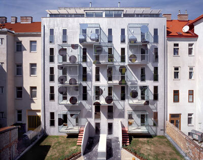 Elegant schloss Architekt August Sarnitz die Baulücke am Laubeplatz in Wien-Favoriten: Spiegelflächen von Eva Schlegel geben Schauloggien zum Park und Wintergärten im Innenhof spezielles Flair. Auf offene Transparenz setzt das Haus der querkraft-Architekten.