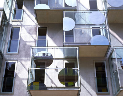 Bauträger GPA setzte auf Qualität und beauftragte die Architekten August Sarnitz und querkraft. Heutigem urbanem Wohnanspruch und dem Block angemessen, sollten sie bei großer Dichte ostwest- belichtete Typen mit Freiraum in überdurchschnittlicher Ausführung bieten. Am Laubeplatz setzt der zurückhaltende Bau von August Sarnitz feine Akzente. Hintergründig gestaltete gestaltete Eva Schlegel die Brüstungen der sichtbetonten „Theaterlogen“ als Spiegelflächen. Aus sicherer Distanz kann man hier das Treiben im Park beobachten. Voyeuristische Tendenzen des Wieners werden im Spiegel des halböffentlichen, parkseitigen Raums ebenso reflektiert wie Baumkronen vorm Himmel. Dezent nimmt der silberfarbene Fassadenputz das Thema auf, in tänzelnder Leichtigkeit kehrt es in den runden, semitransparenten Spiegelfolien der Wintergärten im intimeren Innenhof wieder.