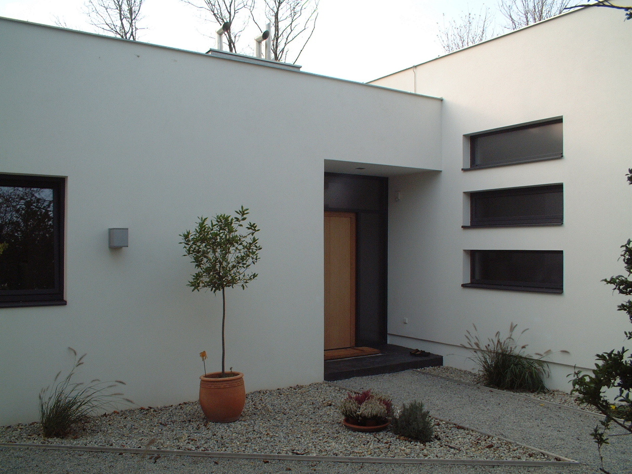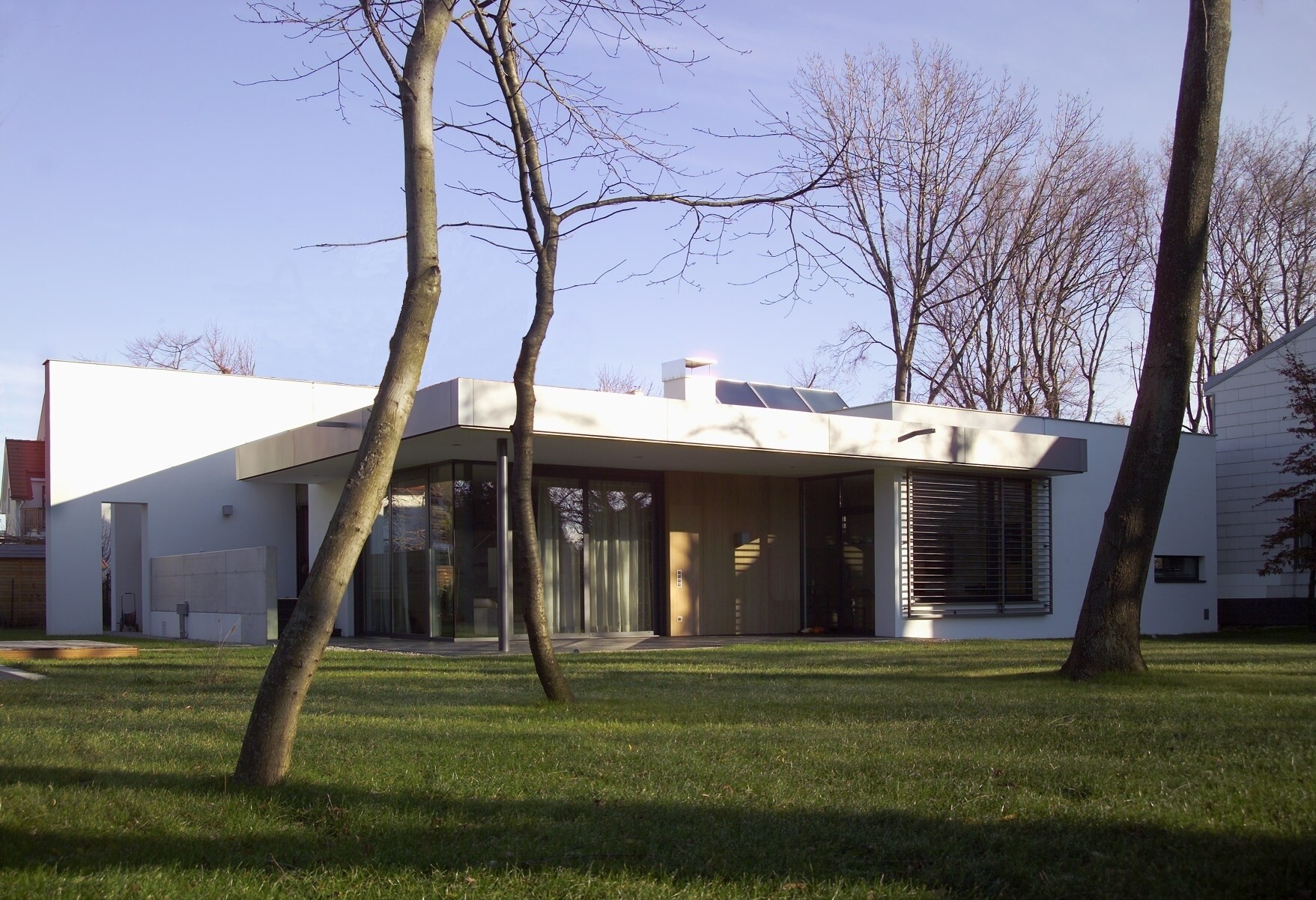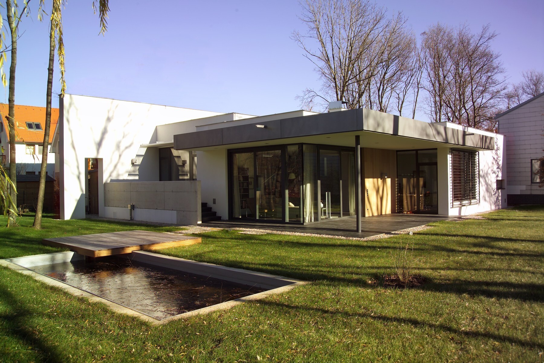 Es sollte zurückhaltend, puristisch und klar sein, mit Flachdach und von der Straße kaum zu sehen. Ein stilles Refugium fürs ganze Leben, wo man ungestört die Natur genießen und ohne überflüssige Treppen erhöht schlafen kann. Die alte Zufahrt blieb, der edle, neue Carport aus Sichtbeton und Gabonen schafft zusätzlichen Sitzschutz. Ein kontemplativer Weg führt am Altbau entlang durch Großmutters Garten zum reduzierten Neubau. Aus horizontalen und vertikalen Scheiben komponiert, zelebriert der niedere, mit nischenbildenden Vor-und Rücksprüngen differenziert gestaltete Baukörper Grundthemen der klassischen Moderne.