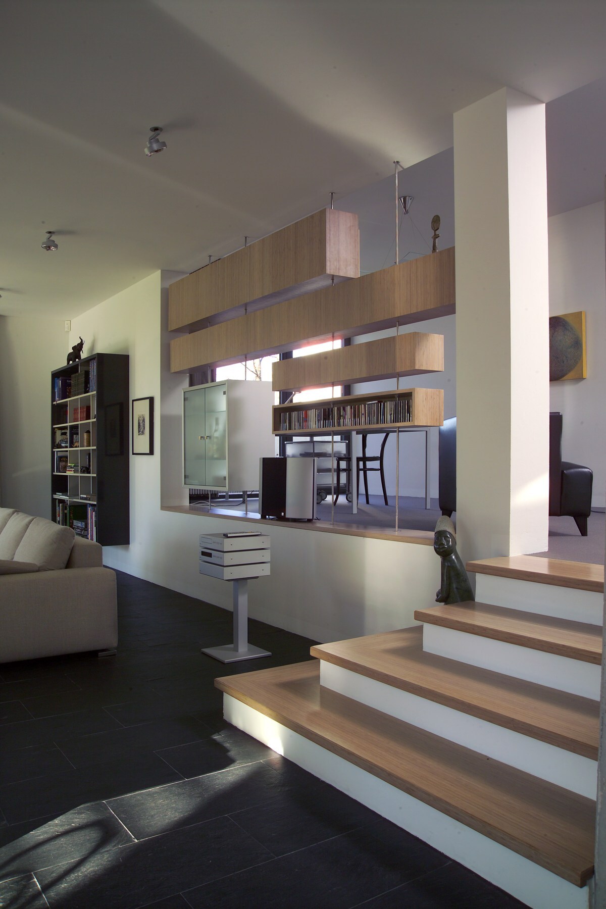 An den Schmalseiten öffnet sich der introvertierte Trakt im Schlafzimmer mit Ostfenster zur Morgensonne, im Westen fließt er mit Balkon und Arbeitspodest ins extrovertierte, schiefergedeckte Wohnen am Garten über, Jalousien sind unterm drei Meter auskragenden Dach kaum nötig. An zarten Stahlseilen in den Wanddurchburch geklemmte, horizontale Regale bilden den beidseitig bestückbaren, blickdurchlässigen Übergang zur Ebene darunter, der Kamin mit verglaster Feuerstelle die Trennung zum Essen mit Terrassenzugang und Südfenster, an einer Schiebetür schließt im Osten die Küche an. Auf Grasniveau fließt das Wohnen in den Garten mit Kiefern, Esche und Nussbaum. Armin Haderer gestaltete ihn mit Kies und Wasserbecken, dessen Lichtreflexe über die Dachuntersicht auf die Wohnraumdecke tanzen, japanisch schlicht.