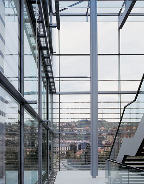Für die Verkleidung des inneren Würfels wurden Krustenplatten in Solnhofer Jura-Kalkstein gewählt. Der warme Farbton, die prähistorischen Einschlüsse und die raue Oberfläche der Platten stehen in bewusstem Kontrast zur kühlen Glasfassade und zum silbrig-matten Glasbelag der Umgänge und des Haupttreppenhauses. Auf der Oberseite des Steinwürfels bietet ein rundum verglastes Restaurant ebenfalls einen Rundblick über die Stadt.