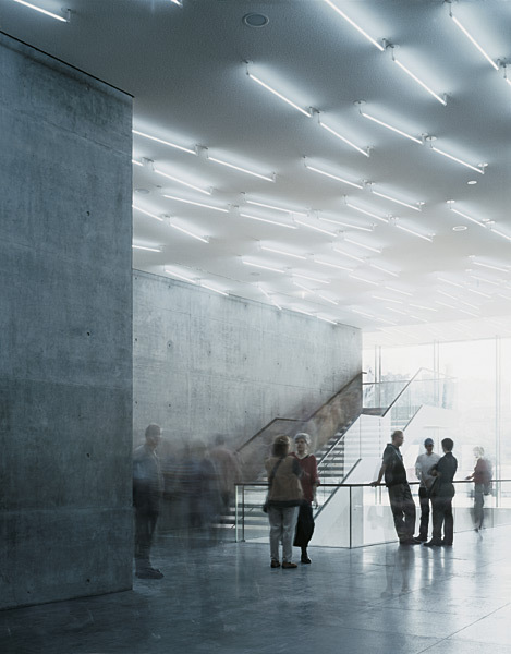 Die minimalistische Glasfassade des 26 Meter hohen Kubus hat mit ihrer verdichteten Bedruckung im unteren Bereich etwas Abgehobenes, bis zu einem gewissen Grad auch Abweisendes, Kühles. Der Haupteingang und das große Foyer dagegen sollen einladen, ohne aufdringlich zu sein. Kasse, Espressobar, Museumsshop und Garderobe machen das mit schwarzen Basalt-Lava-Platten ausgelegte Foyer zum Dreh- und Angelpunkt des Hauses und zugleich zur Übergangszone. Eine große Stahltreppe verbindet die vier Geschosse des Kubus mit den beiden Hauptausstellungsebenen im Erd- und Untergeschoss. Die ersten beiden Ausstellungsebenen des Kubus sind über einen zentralen Raum, der sich durch beide Etagen zieht, miteinander verbunden. Der größte Ausstellungsraum des gesamten Museums befindet sich im 3.Obergeschoss. Die selbst öffnenden Glastüren erlauben in allen Stockwerken jederzeit ein Hinaustreten in die Kubusumgänge mit ihrem Panoramablick auf Stuttgarts Innenstadt und die umliegenden Hänge.