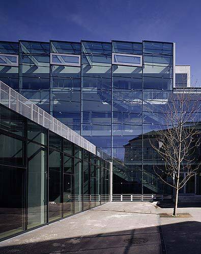 Der Neubau der Musikschule Kufstein lässt das Bild von Eierkarton-gedämmten Proberäumen in düsteren Kellern weit in die Vergangenheit rücken. Mit seinem Wettbewerbsbeitrag setzte sich das Innsbrucker Architektentrio riccione (Clemens Bortolotti, Tilwin Cede und Mario Ramoni) dem Image entgegen, dass Musikunterricht hinter schwerem Gemäuer stattzufinden hat. Mit gekonnten Planungsansätzen und durchdachtem Materialeinsatz gelang ein architektonischer Lichtblick im doppelten Wortsinn: der zeitgemäße Musikschultypus steht stellvertretend für die Tatsache, dass selbst die speziellen raumakustischen Anforderungen an eine Musikschule mit einer transparenten und offenen Bauweise bewältigbar sind. Funktionell vereint der riegelförmige Baukörper die Musikschule (im Obergeschoss), die Stadtbücherei und das Stadtarchiv (im Erdgeschoss) unter einem Dach. Die horizontale Gliederung der nord- und ostseitigen Glasfassade macht die unterschiedliche Nutzung der Geschosse ablesbar. In den Obergeschossen ist jedes der boxenartigen Fassadenmodule jeweils einem Unterrichtsraum zugeordnet. Die Strukturierung der hochwertigen Verglasung hat schalltechnische Gründe: die Schwingungen werden von den einzelnen „Rahmen“ aufgenommen, ohne dass sie auf benachbarte Klassenräume übertragen werden. Als zusätzliche Maßnahme wurden Raum trennenden Bauteile – Wände und Decken – leicht schräg konzipiert. Dadurch verringert sich die Nachhallzeit in den musikerfüllten Räumen, was wiederum das so genannte Flatterecho von Wand zu Wand vermiedet. Neben der üblichen schalldämmenden Wandverkleidung aus gelochten Holzpaneelen sorgen zweierlei textile Vorhänge in jedem Unterrichtsraum für einen individuell einsetzbaren Schall- und Sichtschutz. Je nach Bedarf kann wahlweise der transparente oder der blickdichte Stoff vor Fenster und Wände gezogen werden. Zur Lösung dieser sensiblen Bauaufgabe stand den Architekten der erfahrene Akustikberater Bernd Quiring zur Seite, der vor einigen Jahren beim Umbau des Musikvereinssaales der Wiener Philharmoniker sein Fachwissen eingebracht hatte.