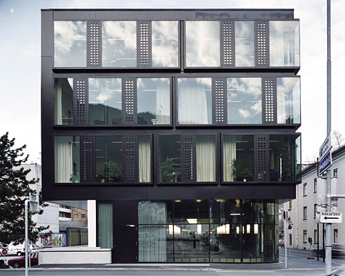 Das vermittelt der großzügige Umgang mit Glas. Aber auch die ziemlich edle, pulverbeschichtete Fassade aus Aluminiumpaneelen in einem sehr dunklen Braun, das in manchen Lichtsituationen fast schwarz wirkt. Alle Hauptfassaden Richtung Straße haben große vorspringende Rahmen, sind voll verglast und strukturiert durch die schmalen, hohen Lochbleche der „Ersatzbrüstungen“. Die „Feuermauern“ an den Schmalseiten, also dort, wo einmal angebaut werden könnte, sind schlicht und geschlossen, nur verkleidet mit Metallpaneelen. Die hofseitige Fassade, vor den Erschließungsgängen, ist ebenfalls verglast, mit einer Schicht Putzbalkonen davor und einer weiteren Schicht aus lotrechten Lamellen zur Beschattung. Daraus ergibt sich ebenfalls ein reizvoller Effekt: Wenn man weiter weg oder schräg vom Gebäude steht, wirkt es an dieser Seite sehr geschlossen. Steht man frontal davor, ergibt sich ein offenes Bild, die Lamellen scheinen fast zu verschwinden.