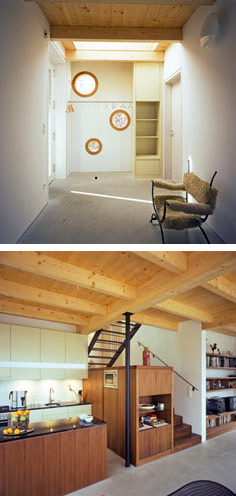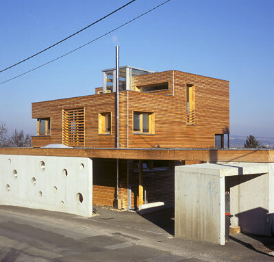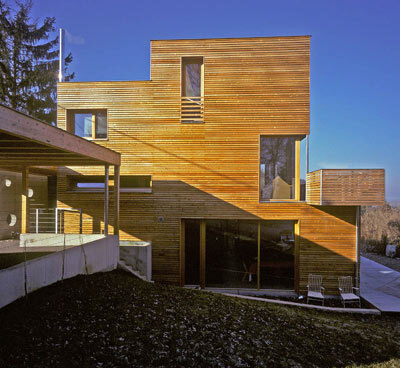 Die Antwort auf Budget und Hang war klar: zwei Geschoße im Süden und drei im Norden. L-förmige Splitlevels umgarnen raffiniert den mittig stehenden Stiegenturm. Das lärchenverkleidete Haus ist - ganz im Zeichen des Niedrigenergiestandards - aus gedämmten Holzteilen, die vorgefertigterweise eine lange Reise aus Tirol hinter sich haben und in nur vier Tagen auf ihrer neuen Fundamentplatte standen.