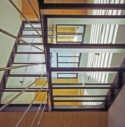 Eine perforierte Sichtbetonscheibe, über die das schimmernde Sonnenlicht tanzt, bildet den blickgeschützten Vorbereich an der Straße. Drei Bullaugenfenster, die im Garderobenbereich spielerisch verstreut sind, richten den Blick hinaus zum Eingang, während durch die Stiege Licht ins ganze Haus fällt. Gläserne Stufen, die an zusammengeschraubten Stahlstangen herabhängen, machen das Stiegenhaus zu einem Lichthaus. Dadurch kann die Helligkeit ungehindert ins Haus strömen. Nebenbei wird dieser Bereich gerne als erweitertes Kinderzimmer genutzt.