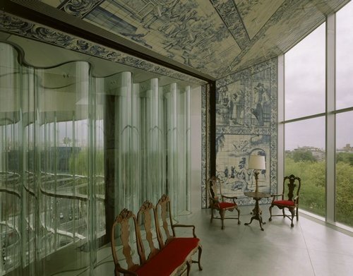 Die öffentlichen Flächen umrunden die Säle, bieten immer wieder Einblicke durch die großen, gewellten, doppelschaligen und damit akustisch dichten Glasflächen. Von der „Eisbar“ mit Glasboden, über einen VIP-Raum mit im Photoshop rekonstruierten Azulejos bis zu Pausenräumen, die mit allen in Portugal bekannten Fliesenformen ausgestattet sind, reicht das spielerische und doch würdige Repertoire, das auch vor Bar-Theken in groben, dunklen Holzbohlen nicht zurückschreckt.