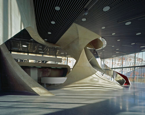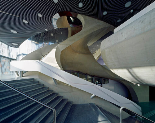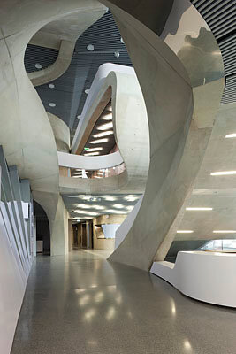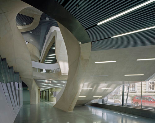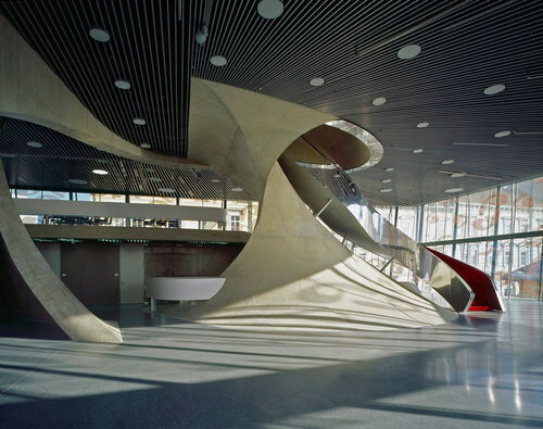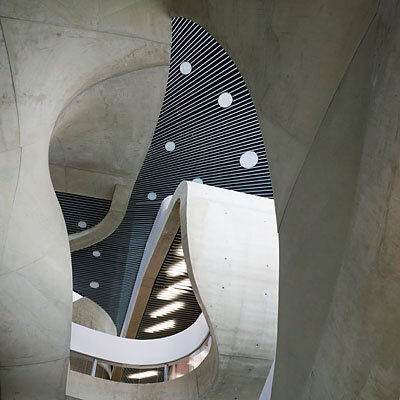 Eine spektakuläre Partitur: In Wogen und Wellen räkelt sich der Stahlbeton, glatt wie Babypopo, durchs Foyer und versetzt das ganze Haus in euphonische Schwingungen.