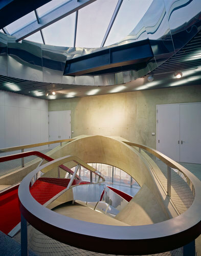 Eine Sinfonie aus Stein, Beton und Edelstahl geleitet den Besucher in den ersten Stock. Sobald man im säulenlosen Pausenraum mit Blick auf Park und Dachlandschaft angekommen ist, erschließt sich einem die Funktion der massiven Betonspirale. Sie ist das statische Rückgrat des Mumuth und trägt ein Drittel des gesamten Hauses. Das konstruktive Konzept - ein Meisterwerk der Ingenieurskunst - stammt vom Londoner Büro Ove Arup & Partners. „Das Ding sieht schlimmer aus als es ist“, sagt Hannes Pfau, Projektleiter bei UN Studio, „statisch betrachtet, ist die Spirale ein simples dreidimensionales Kräftesystem.“