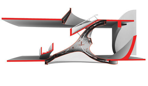 Es spricht der Profi: Die beiden Wände des Konzertsaals, die aus akustischen Gründen ohnehin in Stahlbeton gefertigt werden mussten, werden in den Pausenraum gezogen und um 90 Grad gedreht. Die eine Wand mutiert zur Deckenplatte über dem Erdgeschoß, die andere vollzieht ein Twist nach oben und stellt sich nach erfolgreicher Transformation plötzlich als Dach heraus. „Natürlich wird die Gebäudelast ins Erdreich geleitet - aber nicht etwa über den Betontwist, denn der schwebt schwerelos über dem Boden, sondern über die Seitenwände des Saals.“ Das ist angewandtes Kräftespiel für Fortgeschrittene.