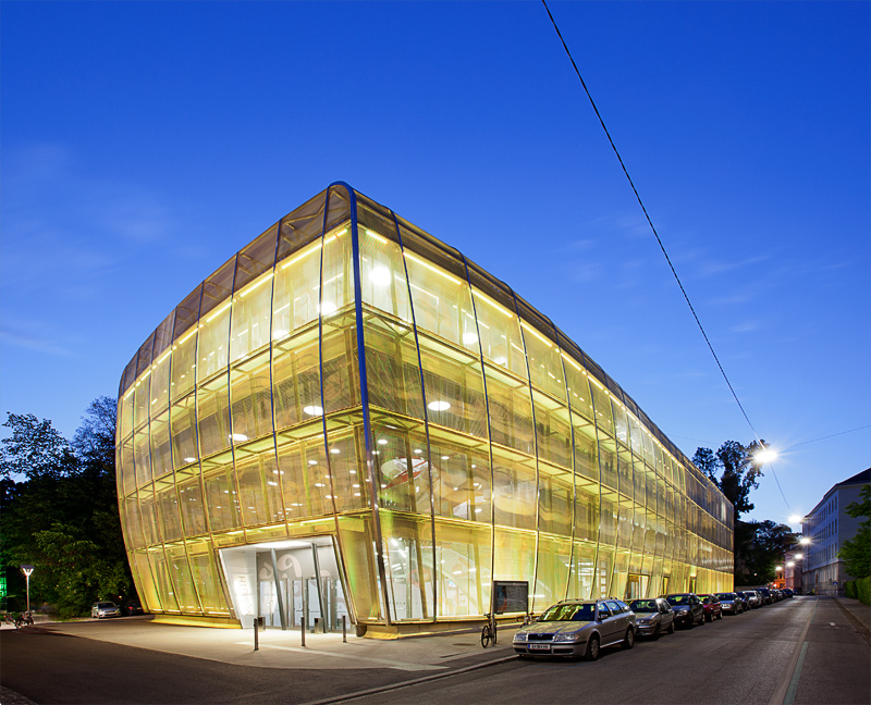 „Ich habe nichts dagegen, dass das Mumuth bei Tageslicht hermetisch und abgeschlossen wirkt“, erklärt Schulz, „eigentlich handelt es sich ja um zwei Gebäude in einem.“ Untertags läuft ganz normaler Unibetrieb, erst am Abend mutiert das Haus zu einem öffentlichen Theater. Auf Knopfdruck geht das Licht an und verwandelt den Dickhäuter in ein zart besaitetes Instrument. Theoretisch soll dabei das Innenleben nach außen gekehrt werden. Theoretisch.