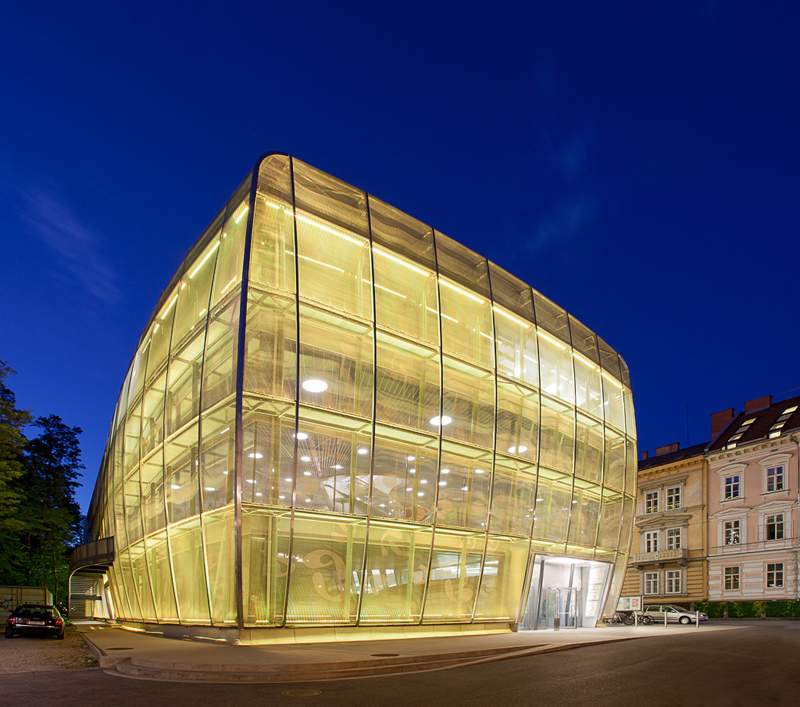 Die Schalung für den Stahlbeton wurde aus Hartschaum gefräst. Der Beton selbst wurde nicht gegossen, sondern unter Druck hineingepumpt. Bei Dämmerung gibt sich das Mumuth als Kiste aus Glas und Edelstahl.