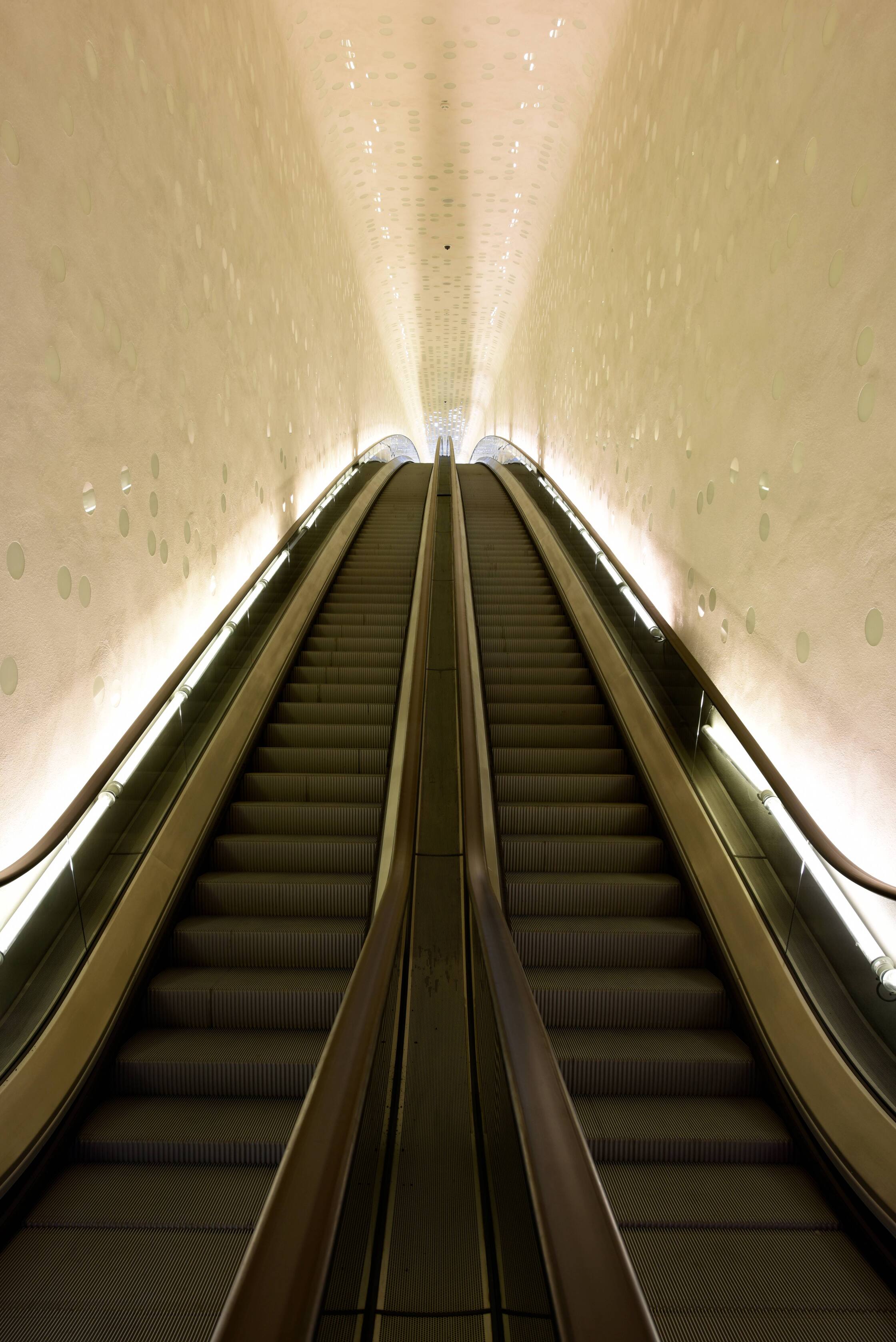 Jeder Besucher der Elbphilharmonie, ob Konzertbesucher, Tourist oder Hotelgast, fährt auf einer 82 m langen Rolltreppe zunächst auf eine kleine Zwischenebene und von dort mit einer weiteren, kürzeren Rolltreppe schließlich auf die Plaza, der ehemaligen Dachebene des Speichers, die heute als Aussichtsplattform und Verteiler in die einzelnen Gebäudebereiche dient. Die rund zweieinhalb Minuten lange Fahrt ist ein Ereignis: Die Rolltreppe steigt nicht gleichmäßig an, sondern beschreibt einen Bogen, dessen Neigungsgrad von 26,5 ° an der Basis zu 8 ° am Ende abnimmt. Durch diesen Kunstgriff wird die Spannung gesteigert, denn der Besucher kann am Anfang der Fahrt noch nicht sehen, wohin ihn die Rolltreppe bringt. Der »Tube« genannte Tunnel ist matt weiß verputzt. In den Putz sind 8 000 runde glänzende, weißliche, zart irisierende Glasfliesen eingelassen. Die Verteilung dieser »Pailletten« erscheint zunächst unregelmäßig, dann doch strukturiert, wie Noten auf einem Blatt Papier. Die Atmosphäre in diesem Raum ist so eigen wie einzigartig. Die indirekte Beleuchtung von unten taucht alles in ein mystisches, diffuses Licht. Es ist ein seltsames Bild, wie das aufwendig in edle Abendgarderobe gekleidete Publikum in diesem kargen, nüchternen, hellen Raum emporfährt – so surreal wie der Anblick von Astronaut Bowman im weißen Zimmer am Ende von Kubricks »2001«.