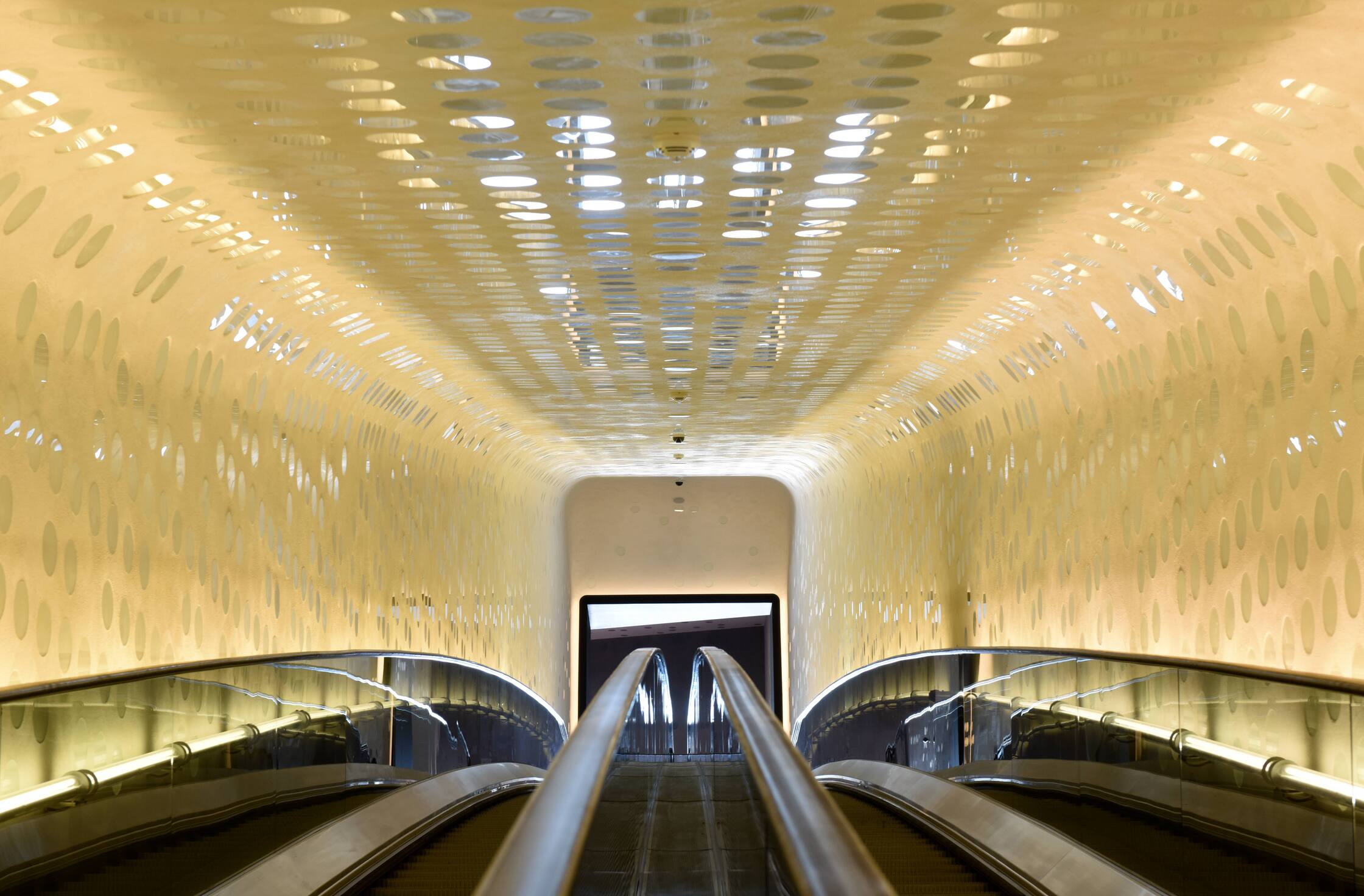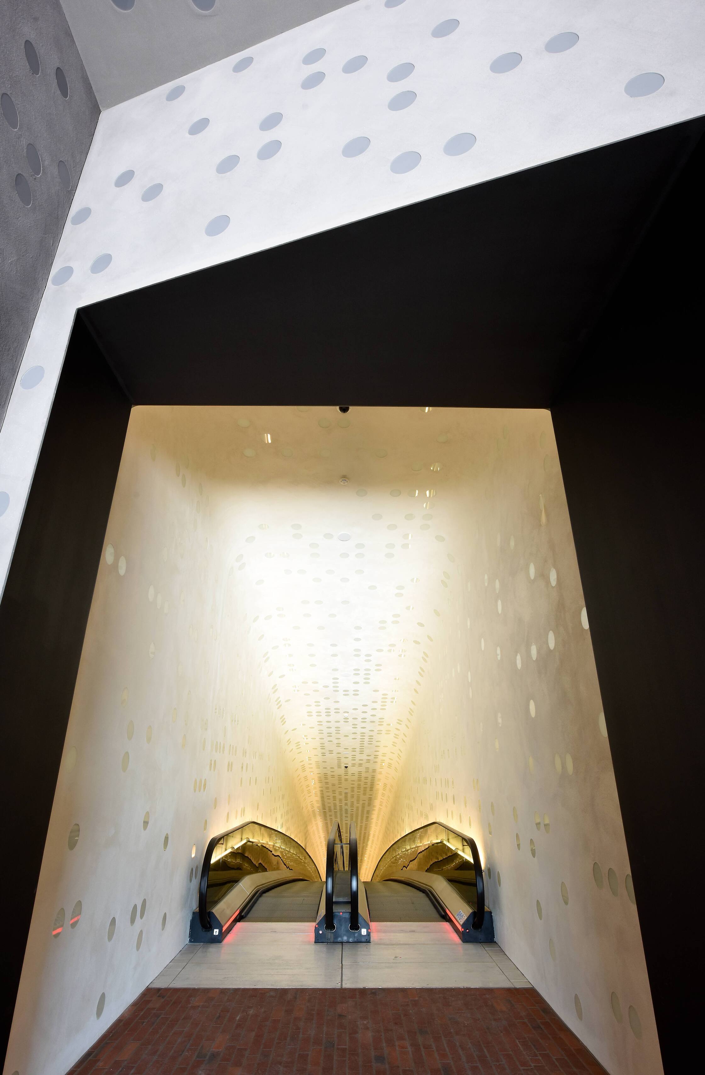 Schon die erste Minute hat es in sich. Auf der 80 Meter langen Rolltreppe, die erst steil ansteigt, um in einer sanften Kurve nach und nach zu verflachen, ehe sie am Ende fast schon einem stufenlosen Förderband gleicht, zeigt sich bereits die kompositorische Anstrengung und Außergewöhnlichkeit des ganzen Hauses. Die Höhenüberwindung könnte dramatischer nicht sein. Denn während der Winkel der elektrisch dahingleitenden Treppe immer flacher und flacher wird, offenbaren sich im groben Putz an den Tunnelwänden runde, eingelassene Glasscheiben. Immer wieder klopfen die Fahrgäste mit den Fingerknöcheln dagegen. Die Fahrt lässt sie ehrfürchtig um sich blicken und verstummen.
