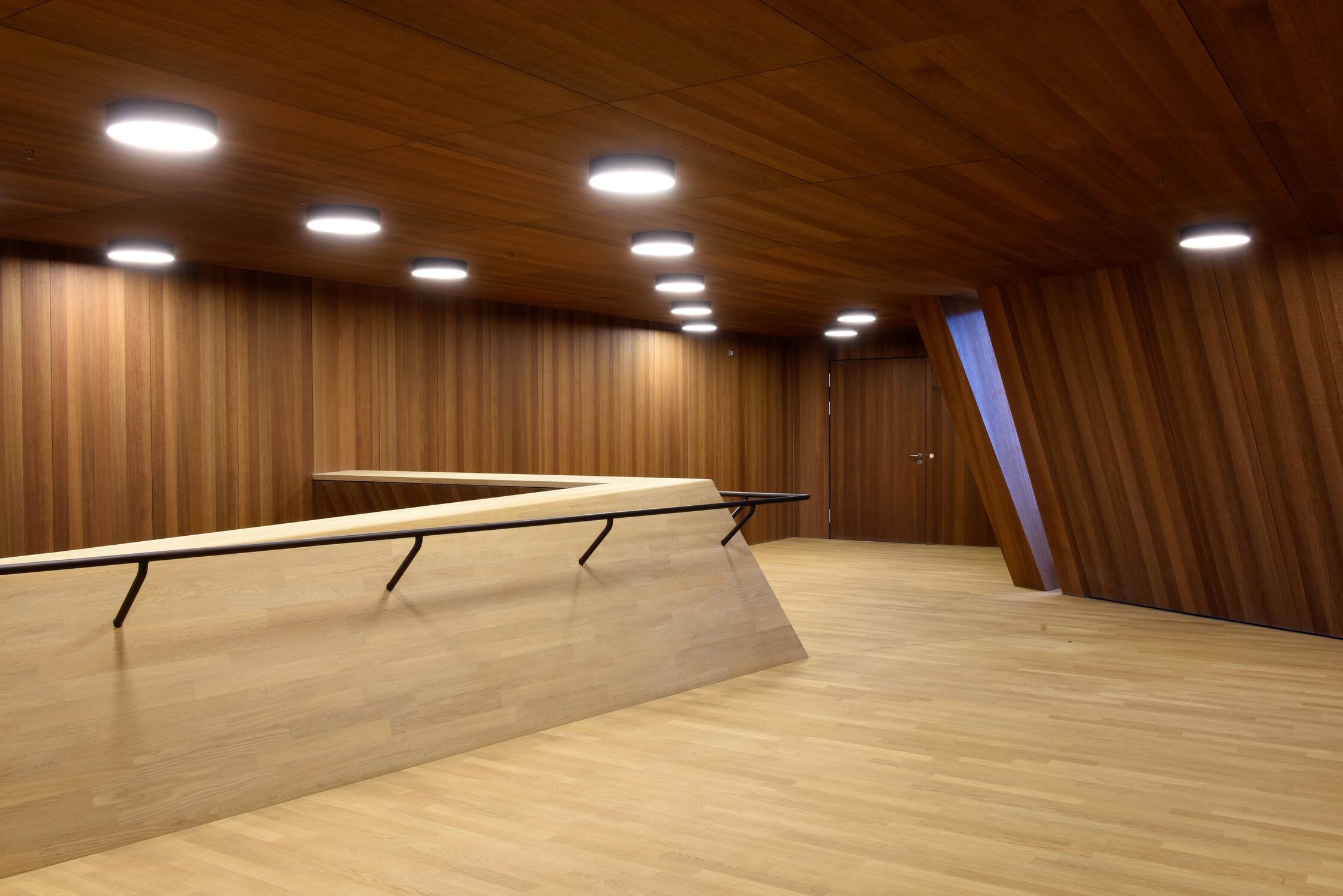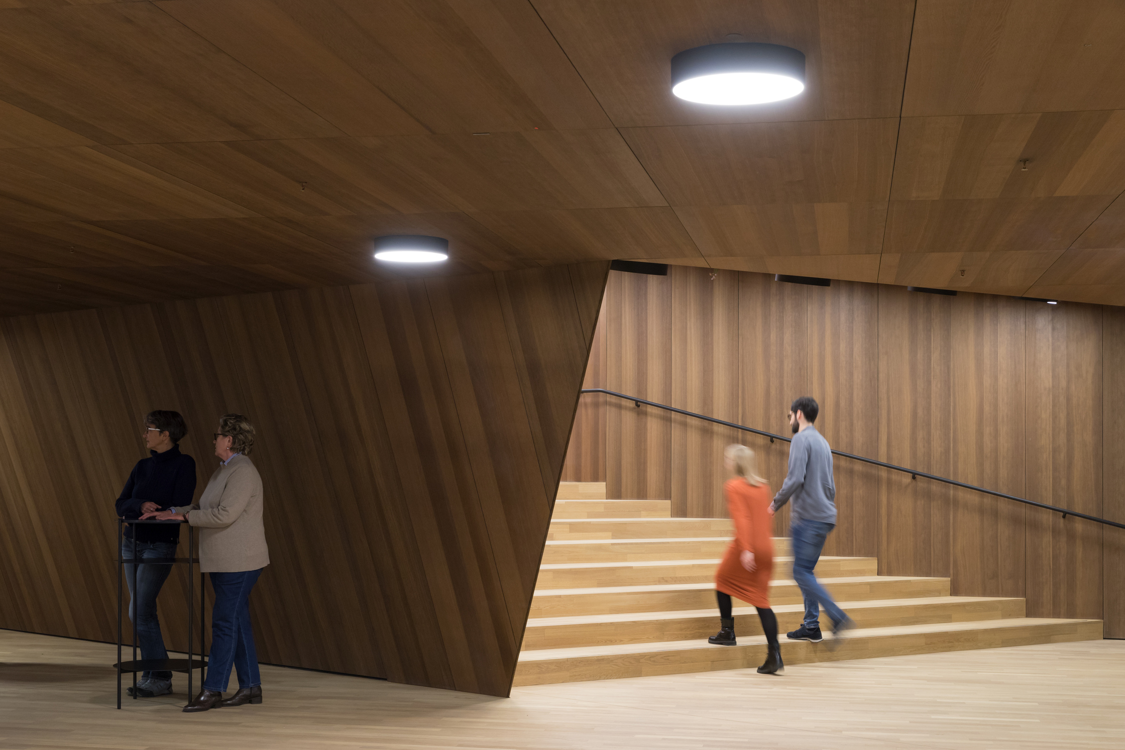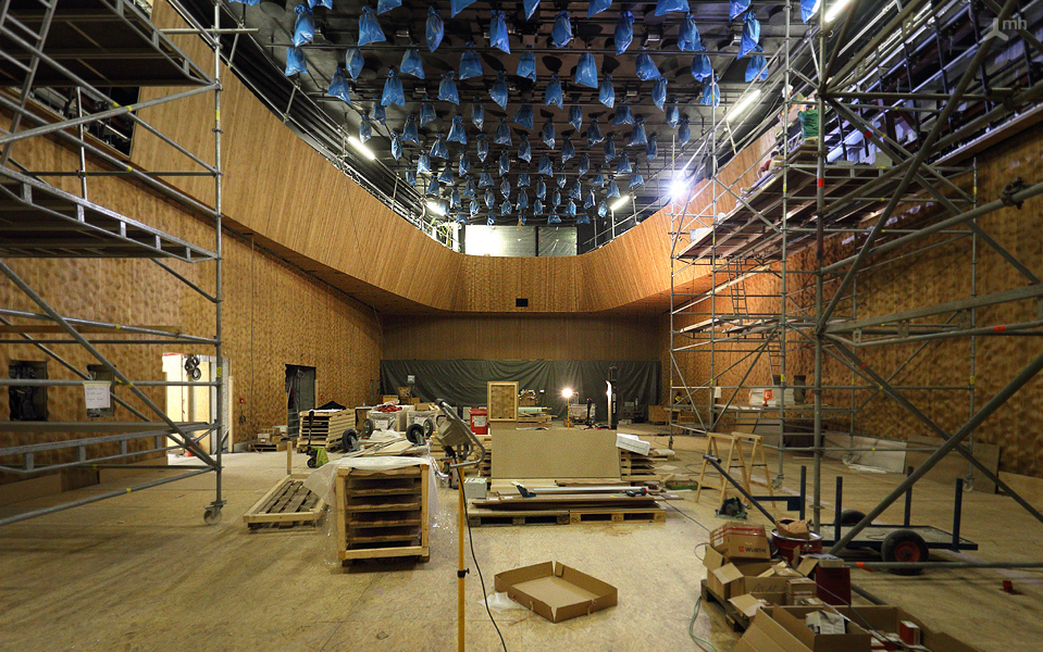 „In der Berliner Philharmonie von Hans Scharoun wurden die Zuschauertribünen erstmals in der Geschichte rund um die Bühne gruppiert“, erzählt Ascan Mergenthaler. „Diese sogenannte Weinbergarchitektur haben auch wir uns zunutze gemacht.“ Und tatsächlich: Als hätte jemand Weinterrassen in den Beton geschlagen, steigt der Große Saal, der bis zu 2100 Menschen fasst, rund um die Bühne in asymmetrisch angeordneten Tribünen hoch.