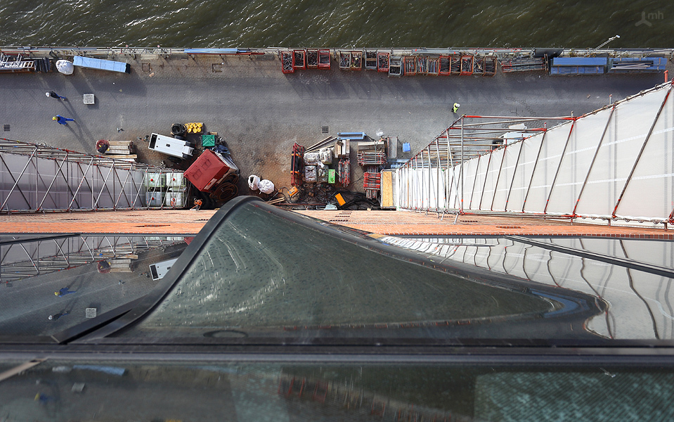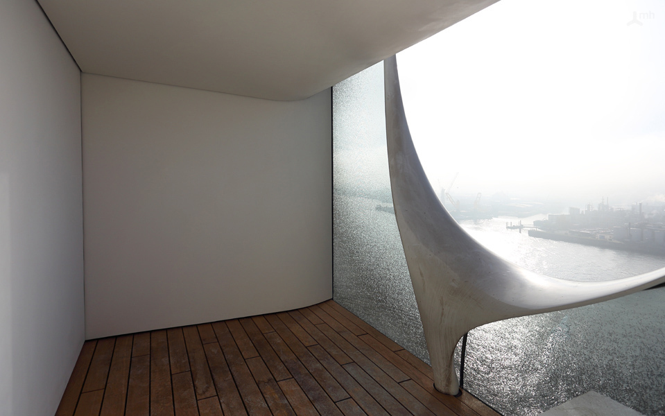 „Das Plateau, das wir auf dem Dach des alten Kaispeichers errichtet haben, ist ein Stückchen Stadt mit Treppen, Gassen, Plätzen, gläsernen Vorhängen und rundumlaufender Empore“, so Mergenthaler. Mit Stolz verweist man auf die dramatisch inszenierten Blickbeziehungen zur Nikolaikirche und zum Hamburger Michel, die sich in der 20.000 Quadratmeter großen, raffiniert gebauchten und spielerisch gepunkteten Glasfassade spiegeln. Die schwersten Glaselemente wiegen 1,2 Tonnen und kosteten bis zu 20.000 Euro pro Stück.