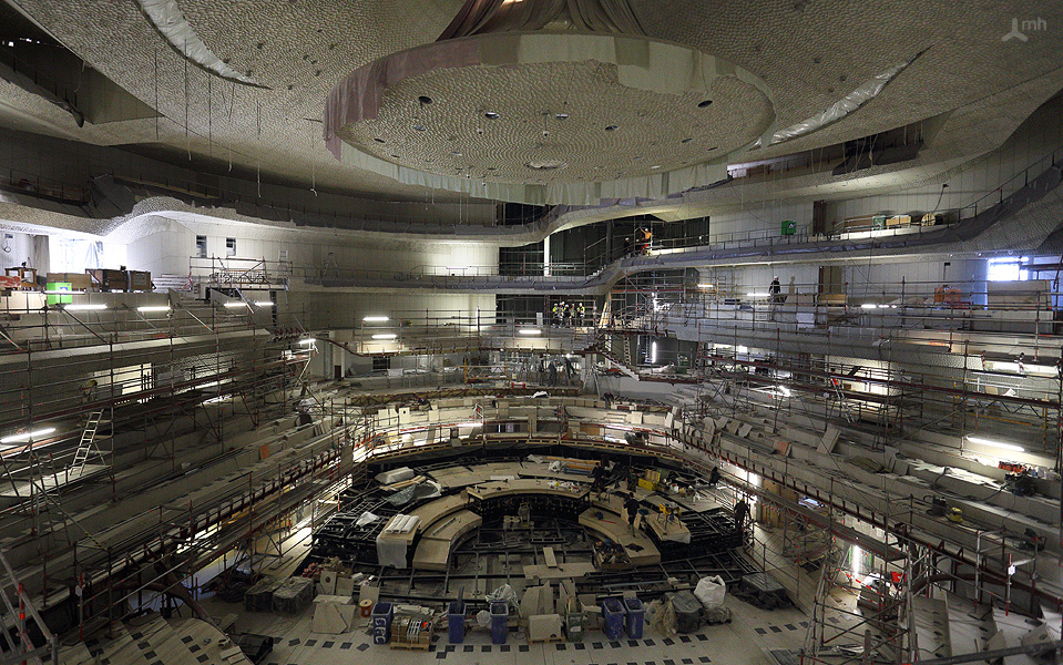Dimensionierung und Lage der völlig unterschiedlichen Dachsegmente von innerer und äußerer Schale wurden mittels komplexer 3D-Modelle der Architekten sowie der Tragwerksplaner bestimmt. Weil die Montagekräne maximal 12 t heben konnten, die Stahlträger des äußeren Schalendachs jedoch bis zu 40 t wiegen, mussten sie in zwei oder drei Montageabschnitte unterteilt werden.
