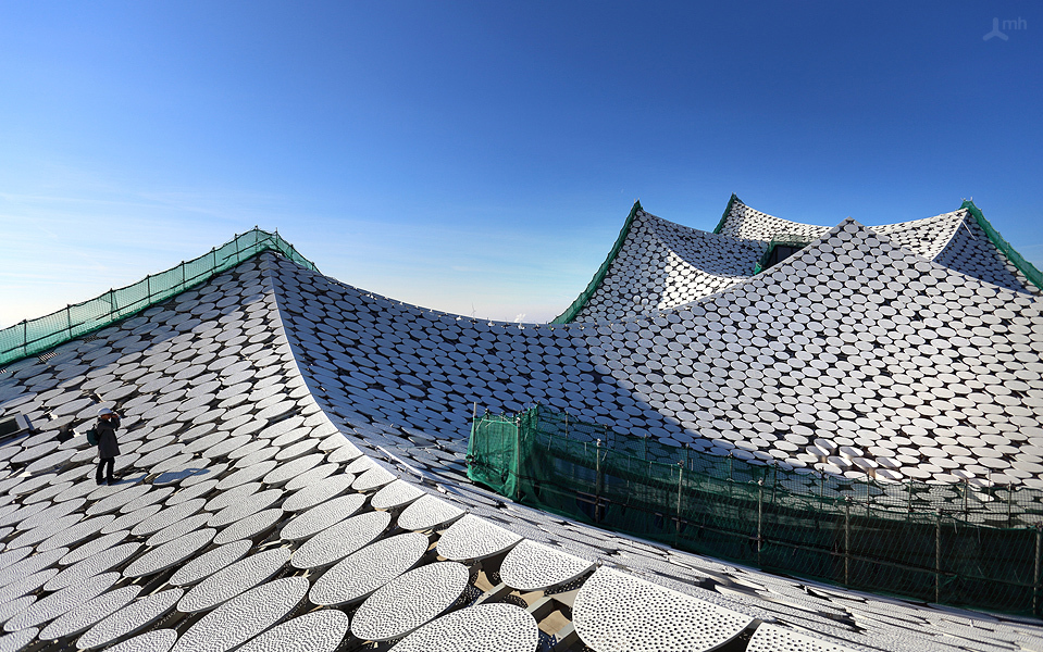 Wer das Glück hat, eine der nicht öffentlichen Dachterrassen zu betreten, wird schließlich auch noch die fünfte Fassade aus der Nähe betrachten können. Das Dach besteht aus insgesamt acht ineinander geschnittenen Beton-Kugelteilflächen, die von 1 000 unterschiedlich gekrümmten stählernen Dachträgern gehalten werden. Sie sind bekleidet mit über 8 000 eloxierten, weiß pulverbeschichteten, gelochten Aluminiumtellern, die das Paillettenmotiv der Tube fortführen – hier allerdings eng und gleichmäßig gesetzt wie auf einem Kleid. Wie die Glasfliesen besitzen auch diese Elemente keine Funktion außer der, dem Dach ein besonderes Gepräge zu verleihen. Das ist wichtig, denn Teile der Dachfläche sind infolge der starken Krümmungen auch von der Straßenebene aus zu sehen. Dieser Gebäudeabschluss zeigt eindrucksvoll eine weitere Nuance der Farbe: Dieses Weiß ist nicht mehr die neutrale, nüchterne Oberfläche von Körpern, sondern in seiner gleißenden Helligkeit ganz eigenständig, entmaterialisiert, dem Himmel auf eine fast metaphysische Weise nahe. So wie Musik in ihrer berückendsten Form.