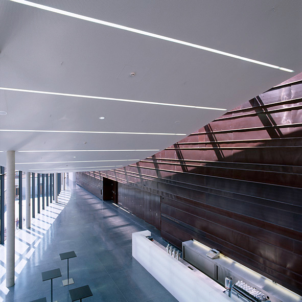 Generell postuliert Dietmar Feichtinger in der ihm eigenen Art: Material ist gleich Farbe. Außerhalb des Saals hält er sich auch daran, Beton, Rigips, Verblechung und Glas in ihren Eigenfarben wirken zu lassen. Die Fassade des Sockelgeschoßes, das demnächst ein Einkaufszentrum beherbergen wird, lässt er hinter die tragende Säulenreihe zurücktreten. Damit wird das darüberliegende Foyer, das mit Transparenz und abendlicher Beleuchtung einladende Offenheit signalisieren soll, ganz ohne grelle Inszenierung akzentuiert.