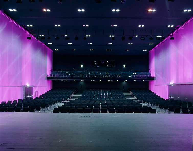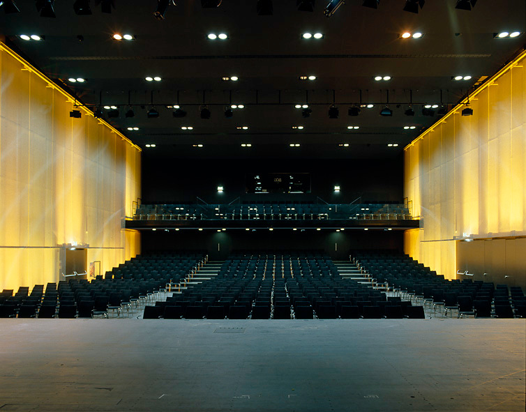 Vorpatiniertes Kupferblech in Form von gekanteten, abwechselnd breiten und schmalen Streifen bildet im Foyer wie über dem Dach die Außenhaut des überhohen zentralen Mehrzwecksaals. Von höher gelegenen Punkten der Stadt aus zeichnet er sich als geschlossene Figur deutlich im Stadtgefüge ab. Der Saal ist mit fixer Bühne, stapelbarer Tribüne, einem Balkon und High Tech ausgestattet. In Material und Farbe ist er kühl und dunkel gehalten. Als Gemütsaufheller fungiert eine Lichtinstallation, die die Seitenwände hinter dem vorgeblendeten Metallgewebe farbig verändert und den Saal in unterschiedliche Lichtstimmungen tauchen kann.
