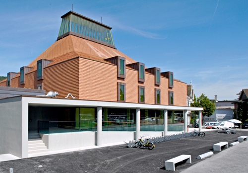 Aber auch bei der Wahl der Materialien bzw. ihrer Verarbeitung treiben die Architekten ein – wohl kalkuliertes – Verwirrspiel. So verkleiden sie den unteren Teil des Daches bzw. eben den oberen Teil der Fassade mit Biberschwanzziegeln – eine Referenz an den ursprünglichen Bau, der im oberen Bereich mit Schindeln verkleidet war, und an traditionelles Handwerk. Die noch makellosen Oberflächen der Ziegel aber lassen an Kunststoff denken. Ähnliches gilt für die körperhaft hervortretenden Fenster, deren tiefe Laibungen mit Kupfer, das bereits nach kürzester Zeit Patina ansetzte, gefasst sind. Sie verweisen auf die ehemaligen Lukarnen. Die strukturellen Metallteile der Laterne mit einem Kupferton einzufärben ist Teil der Strategie, die Grenzen zwischen Alt und Neu zu verwischen, ebenso die verleimten Brettschichtholzträger und -stützen, auf denen die Laterne lagert, mit einem Ton zu beizen, der dem des ursprünglichen Holzes nahe kommt.