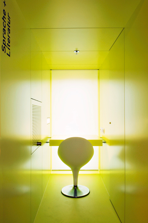 Auch im Untergeschoss haben die Architekten weitgehend auf die bestehende Statik der Betonpfeiler und Unterzüge bauen können. Einen verfremdenden Effekt erzielten sie, indem sie ihnen einen silbergrauen, mit Glimmer versehenen Anstrich verpassten, der ausserdem die Beleuchtung unterstützt. Wie Möbelstücke sind die «giftig» gelb-grünen Einbauten behandelt und von der Decke jeweils durch einen Lichtschlitz abgesetzt.