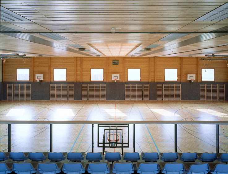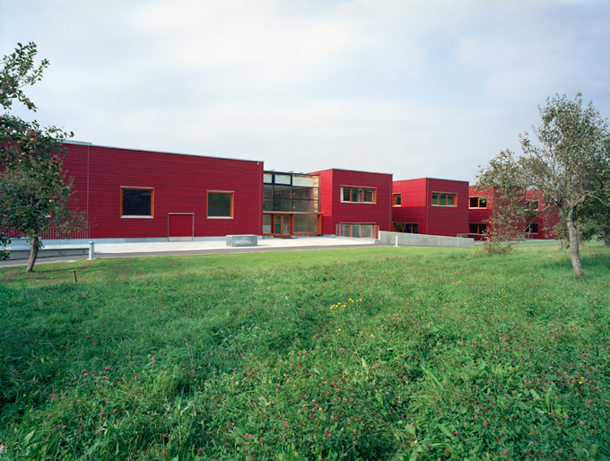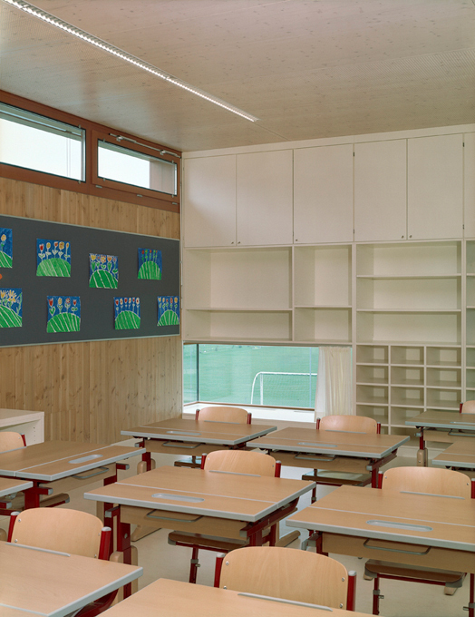 Das Schulhaus sollte durchlässig sein, um die „Ausdehnung“ der Landschaft von den hauseigenen Gärten zu den Feldern und Wiesen am Talgrund nicht zu behindern und den optischen Eindruck zu erwecken, dass die Wiesen durch das Gebäude fließen. Um dies zu erreichen, haben die Architekten die Baumasse in vier frei stehende Kuben aufgelöst, die jeweils in zwei Geschoßen vier Räume für Klassenzimmer, Sonderklassen, das Lehrerzimmer oder die Direktion erhalten. Miteinander verbunden sind sie durch vollflächig verglaste Zwischenbereiche, die die Gangflächen beider Geschoße bilden und zugleich Pausenräume sind. Linear ergänzt werden die vier Klassenhäuser durch einen mächtigen Turnsaal an der anderen Seite des zentralen Haupteingangs. Alle konstruktiven Bauteile der vier „Kisten“ sind in Holz ausgeführt und ihre Oberflächen außen mit beschichteter sägerauer Lärche und innen weitgehend mit Eiche belegt. Ihr Grundmaß leitet sich von der Größe eines Klassenzimmers ab.